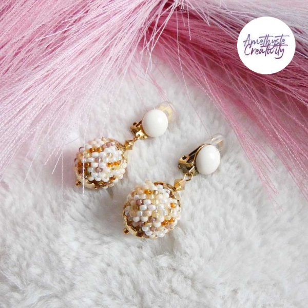 SYRA || Boucles d’oreilles Crochetées Boules de 17 mm en Perles “Miyuki” et Acier Inoxydable – Beige (VERSION OREILLES NON PERCEES)