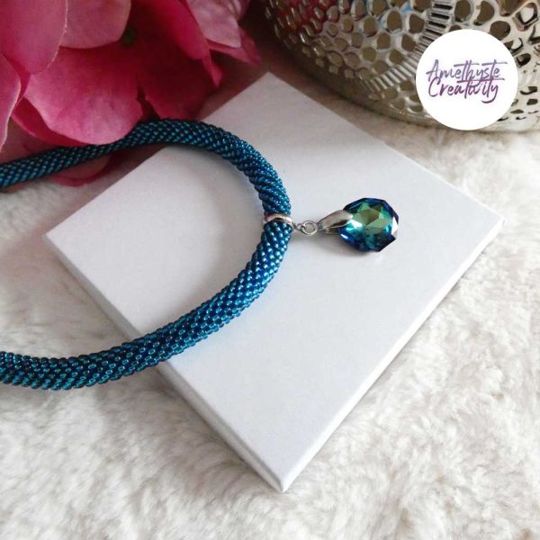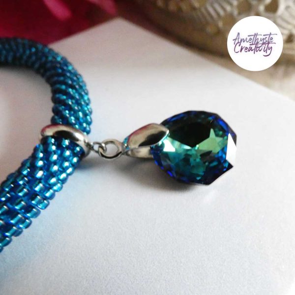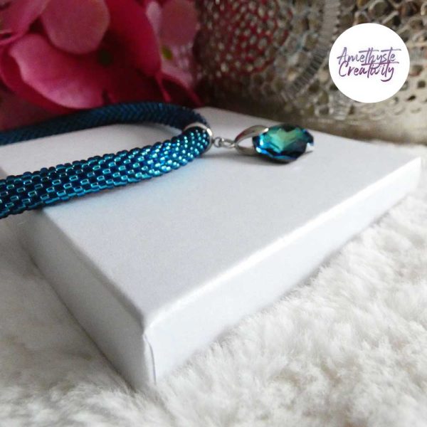 SAPHYRA || Collier Fin avec Breloque « Purecrystal » Fait Main Crocheté En Perles “Miyuki” – Bleu Saphir