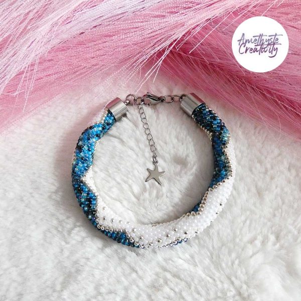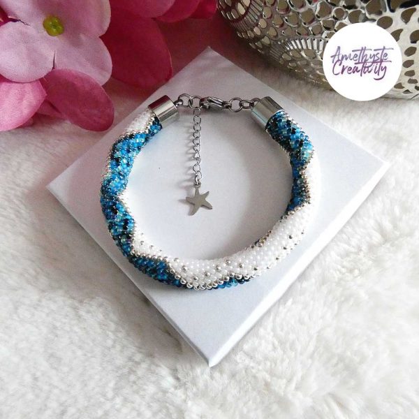 MIRALYS || Bracelet Crocheté Fait Main en Acier Inoxydable et Perles “Miyuki” – Bleu & Blanc
