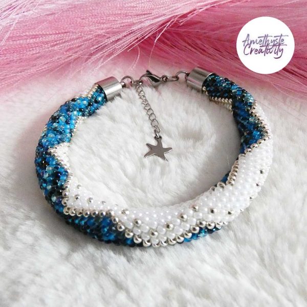 - Voici un bracelet, réalisé par mes soins. Bracelet spirale réalisé au crochet avec des perles japonaise “Miyuki” de 15/0 c’est à dire de 1,5 mm. Chaque perles sont crochetées les unes aux autres rendant le bracelet solide et souple.