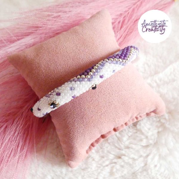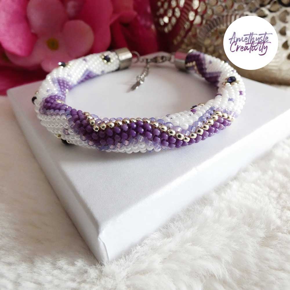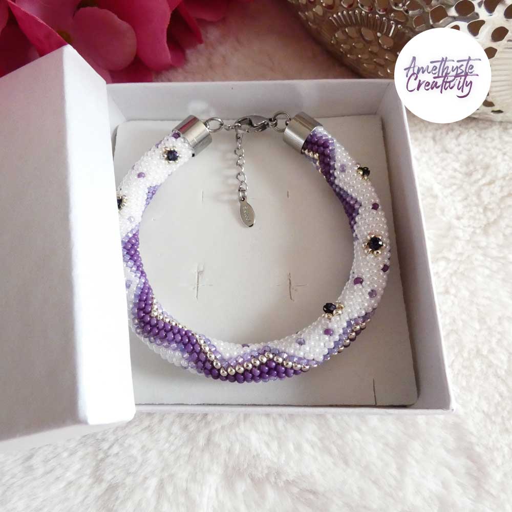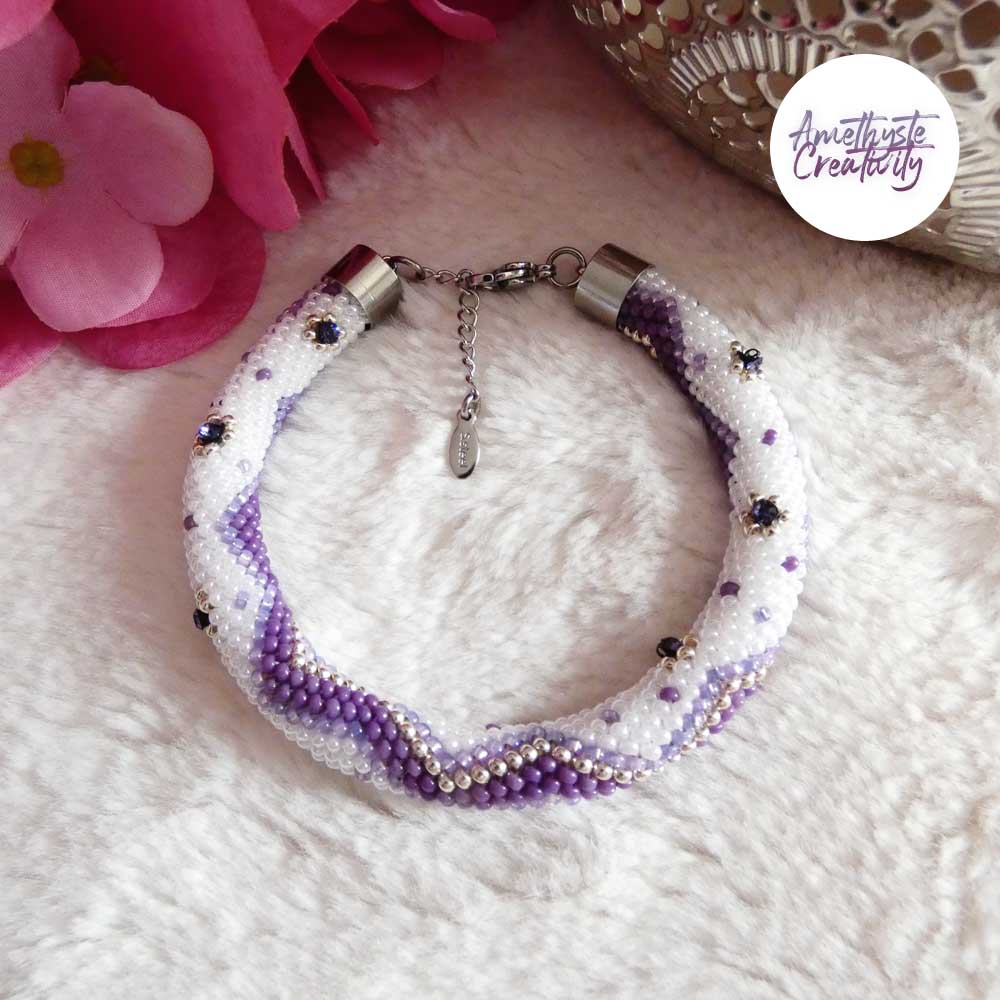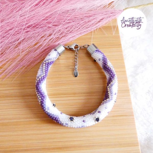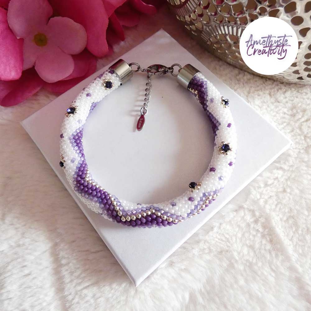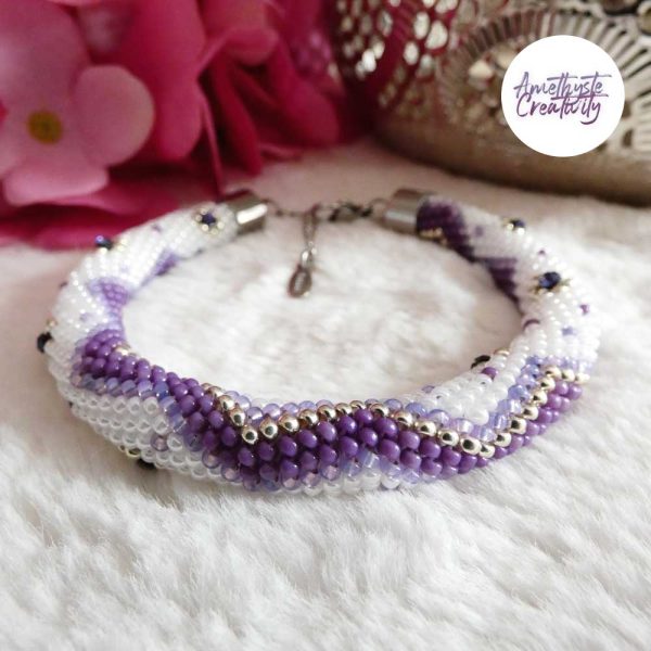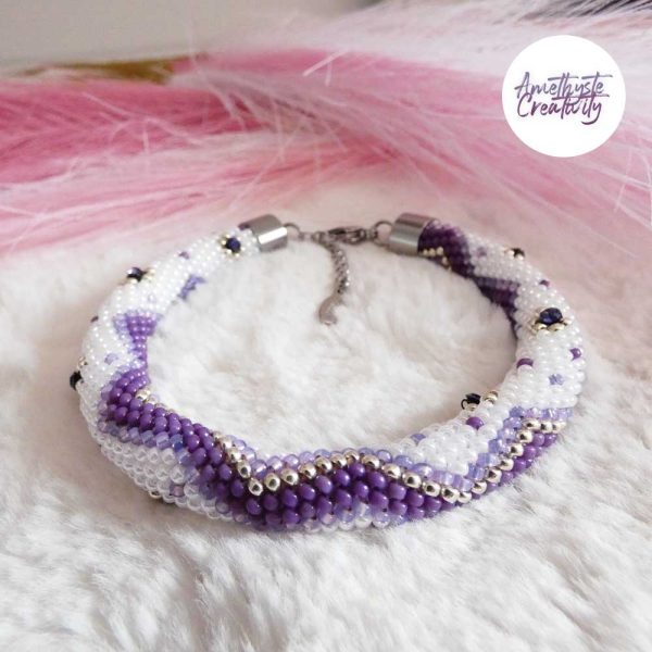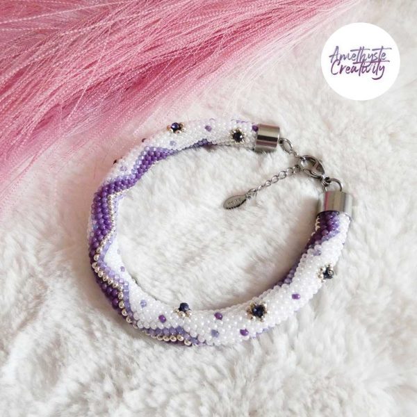 Et voici un bracelet réalisé au crochet avec des perles japonaise “Miyukis” de 11/0 (2mm) et des Meshs Swaroskis qui sont de petits cristaux à coudre. Ce bracelet est réalisé à la main par mes soins ainsi que son schéma (Design by Amethyste Creativity, reproduction interdite).