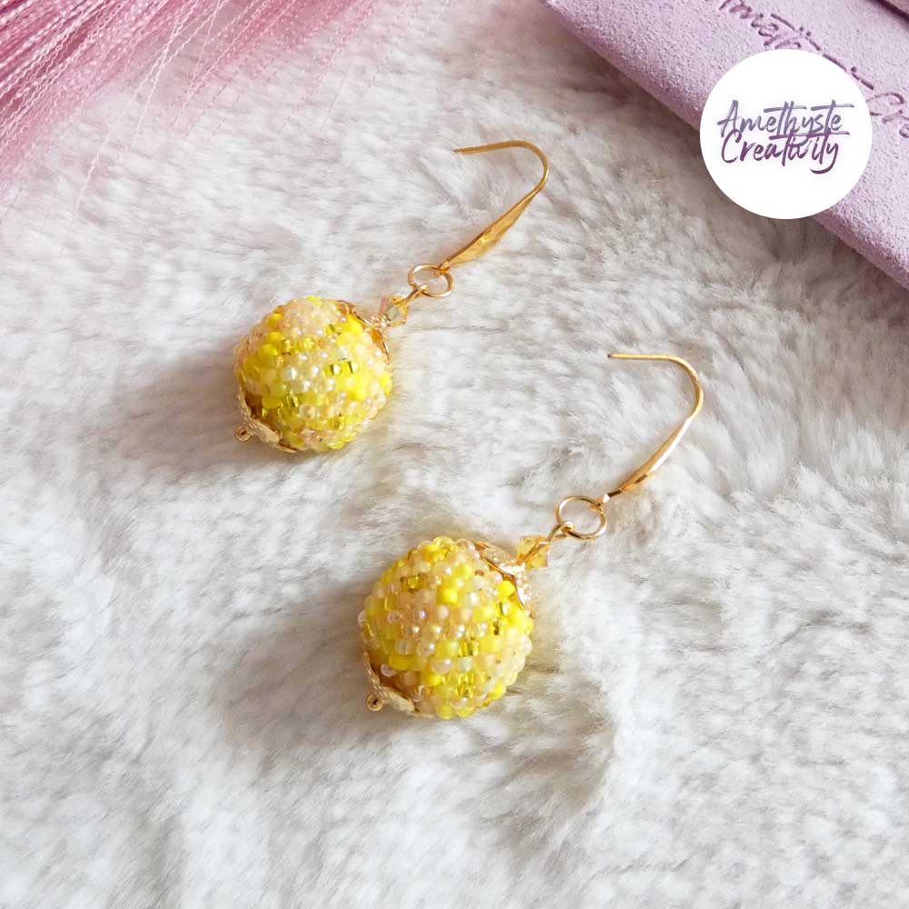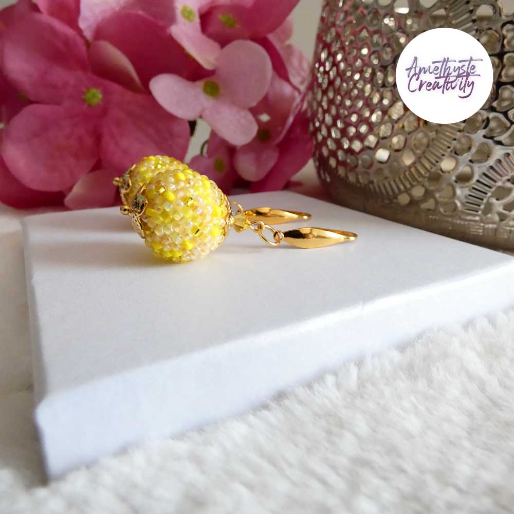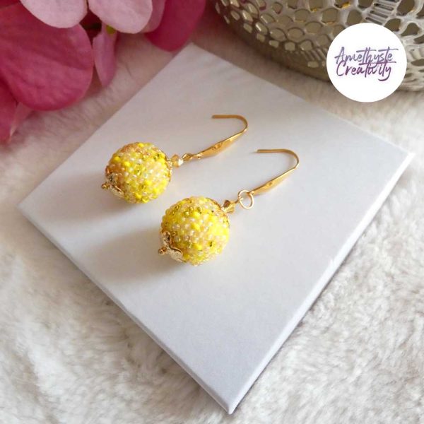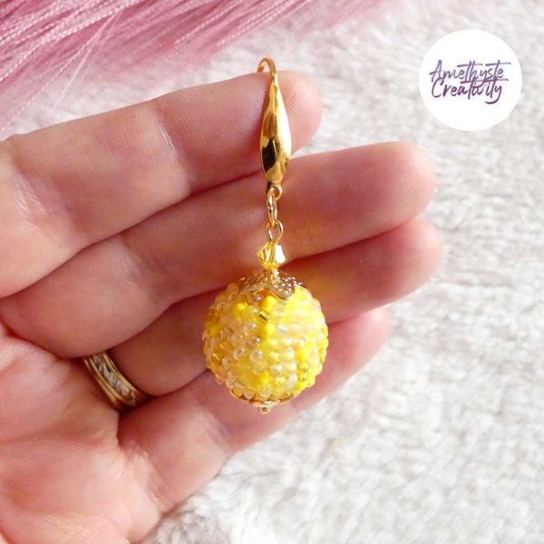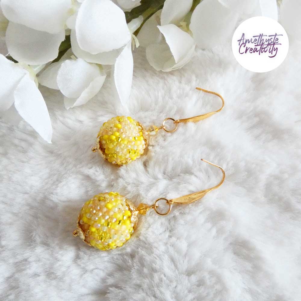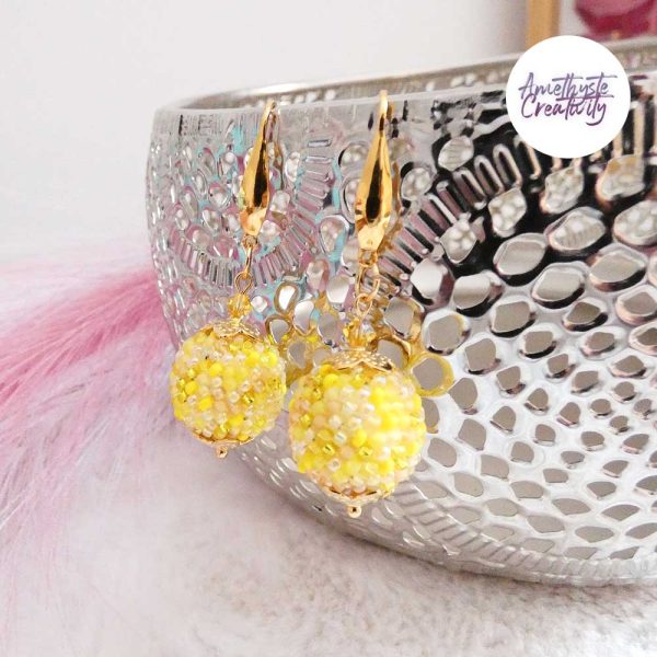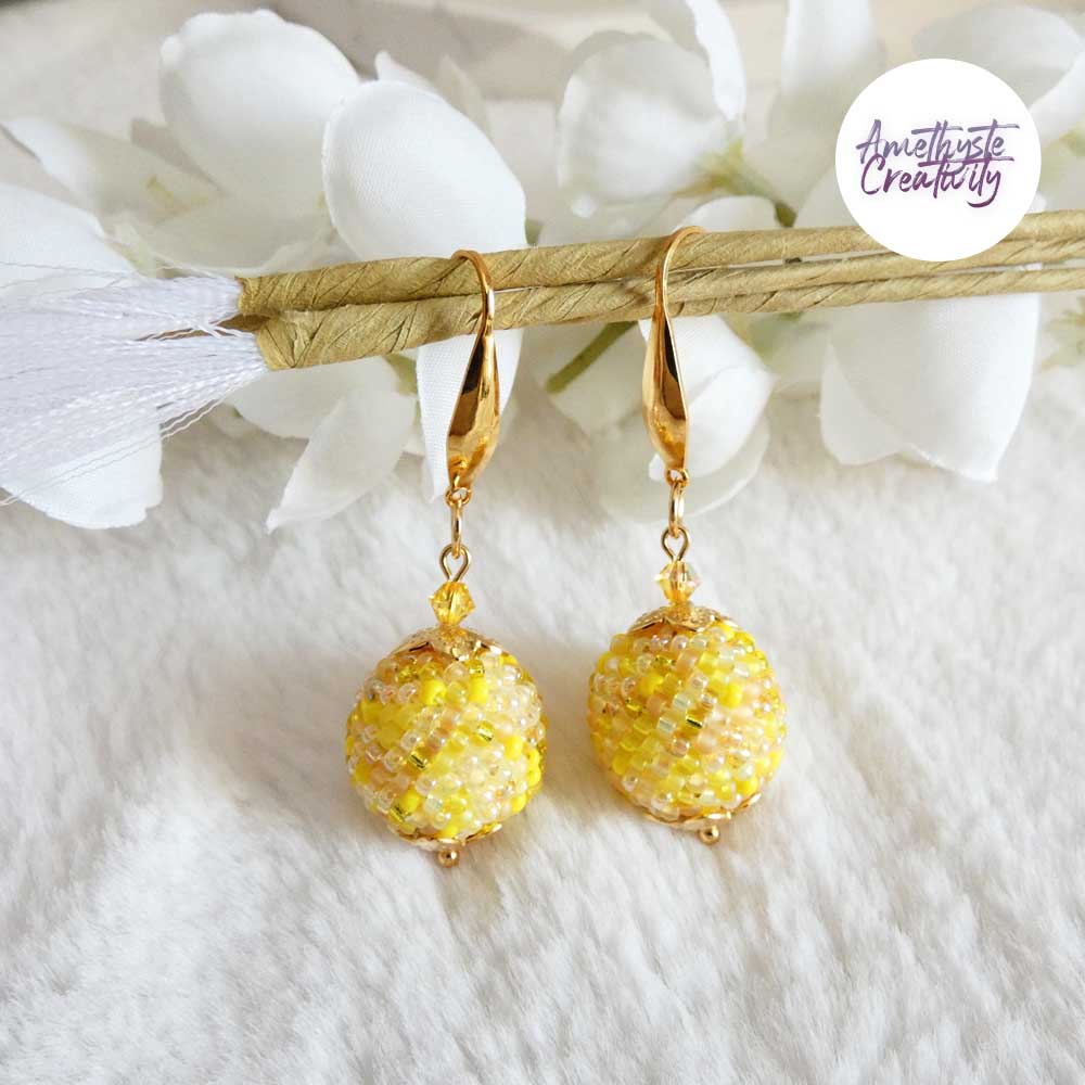 SYRA || Boucles d’oreilles Crochetées Boules de 17 mm en Perles “Miyuki” et Acier Inoxydable – Jaune