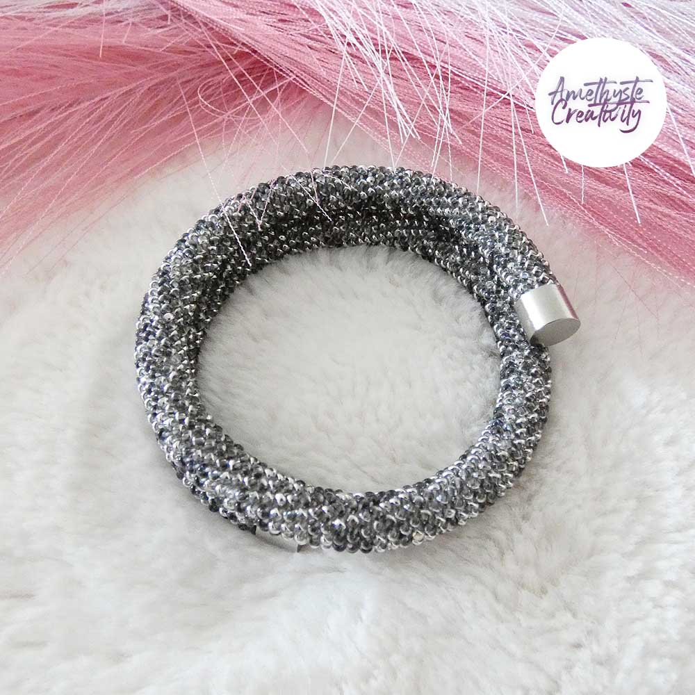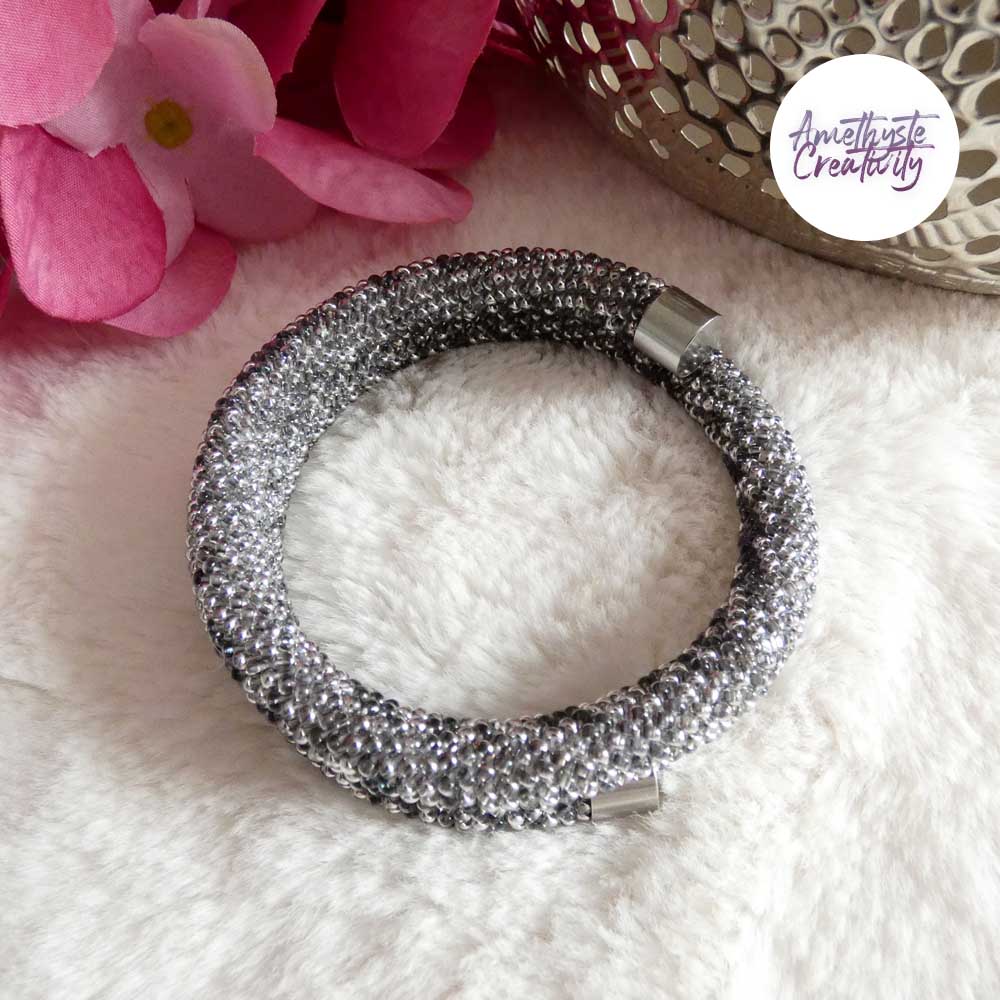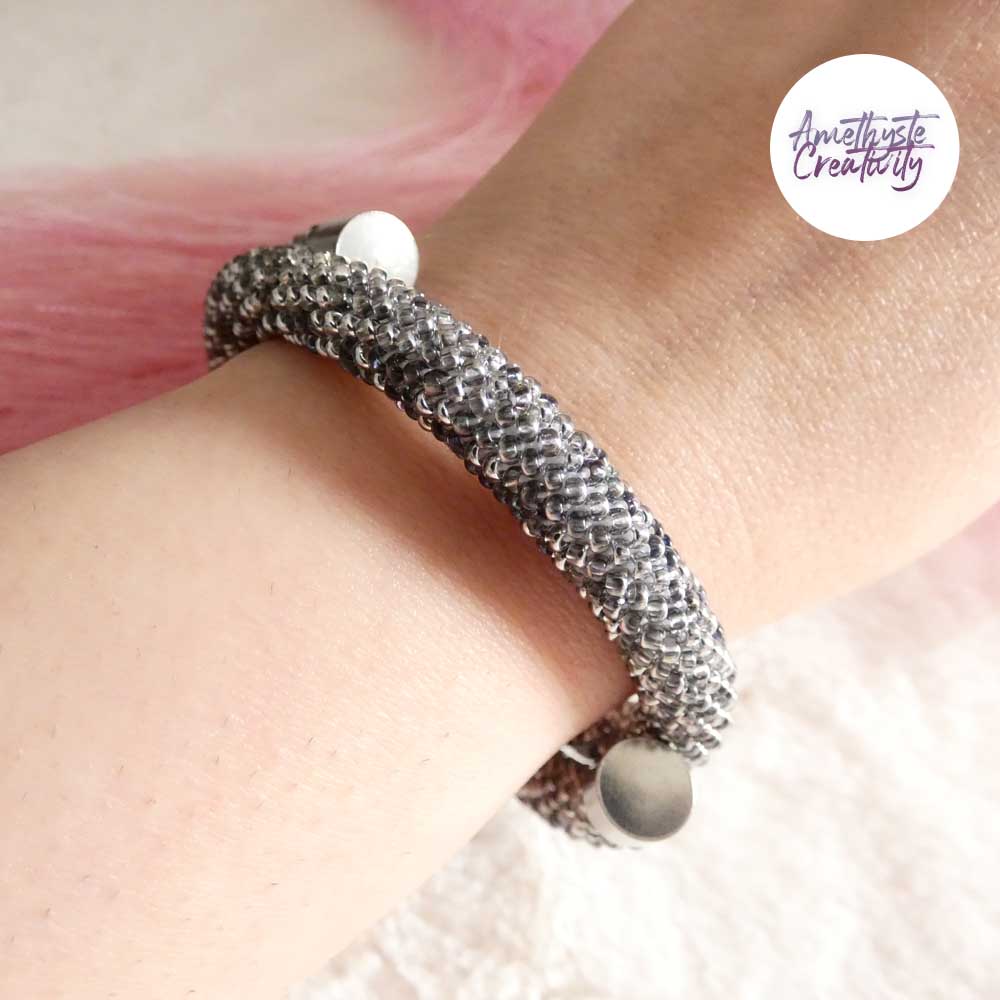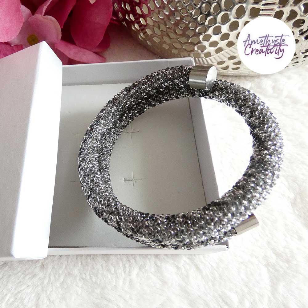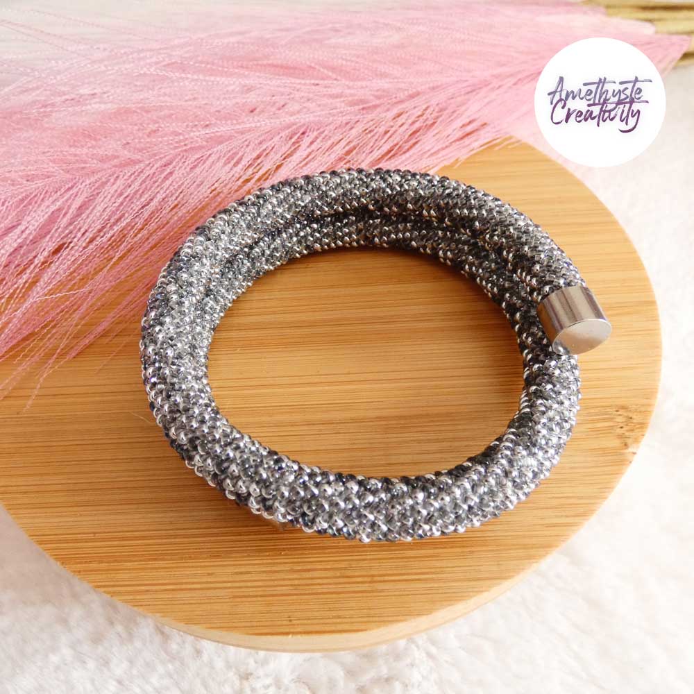 Ce bracelet mémoire sans fermoir est entièrement crocheté à la main avec des perles Miyuki, reconnues pour leur finesse et leur éclat. Léger, souple et confortable, il épouse naturellement la forme du poignet sans nécessiter de fermeture, grâce à sa structure en spirale.