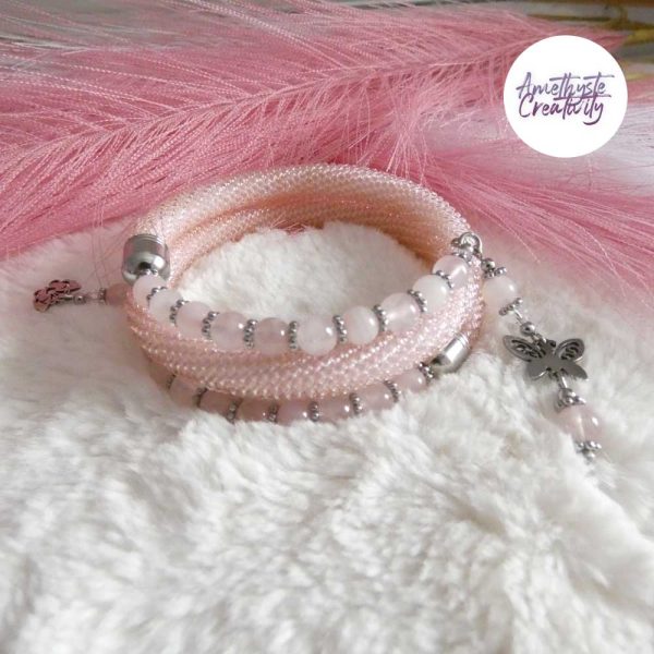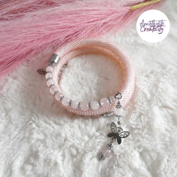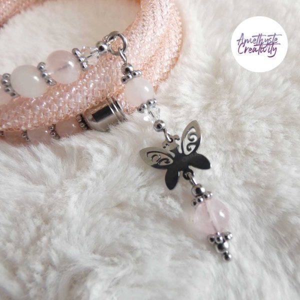 BUTTERFLY || Bracelet Sans Fermoir Crocheté Fait Main En Acier Inoxydable Et Perles “Miyuki” & Quartz rose