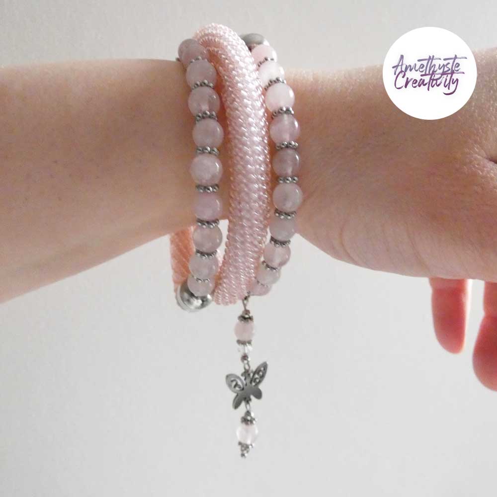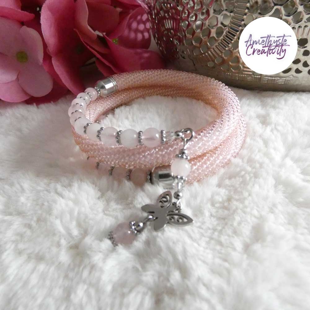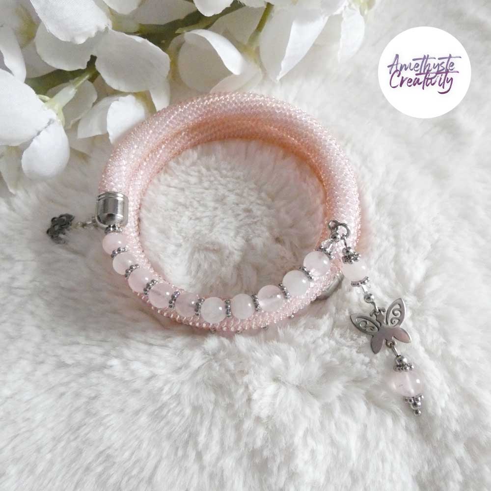 BUTTERFLY || Bracelet Sans Fermoir Crocheté Fait Main En Acier Inoxydable Et Perles “Miyuki” & Quartz rose