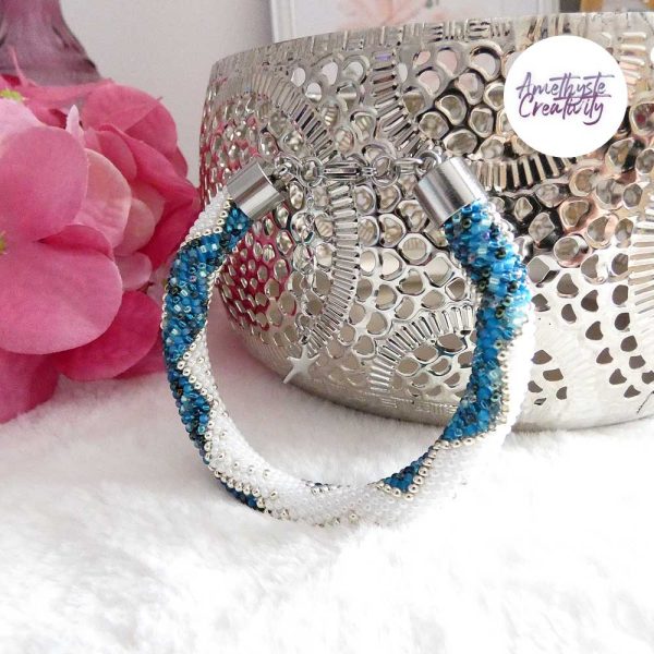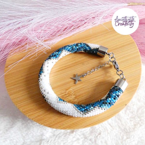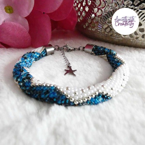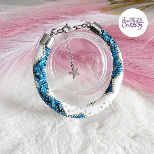 Il s’agit d’un bracelet spirale réalisé au crochet avec des perles japonaises « Miyuki » de taille 11/0 (2 mm). Chaque perle est soigneusement crochetée à la main, ce qui confère au bracelet à la fois solidité et souplesse.
