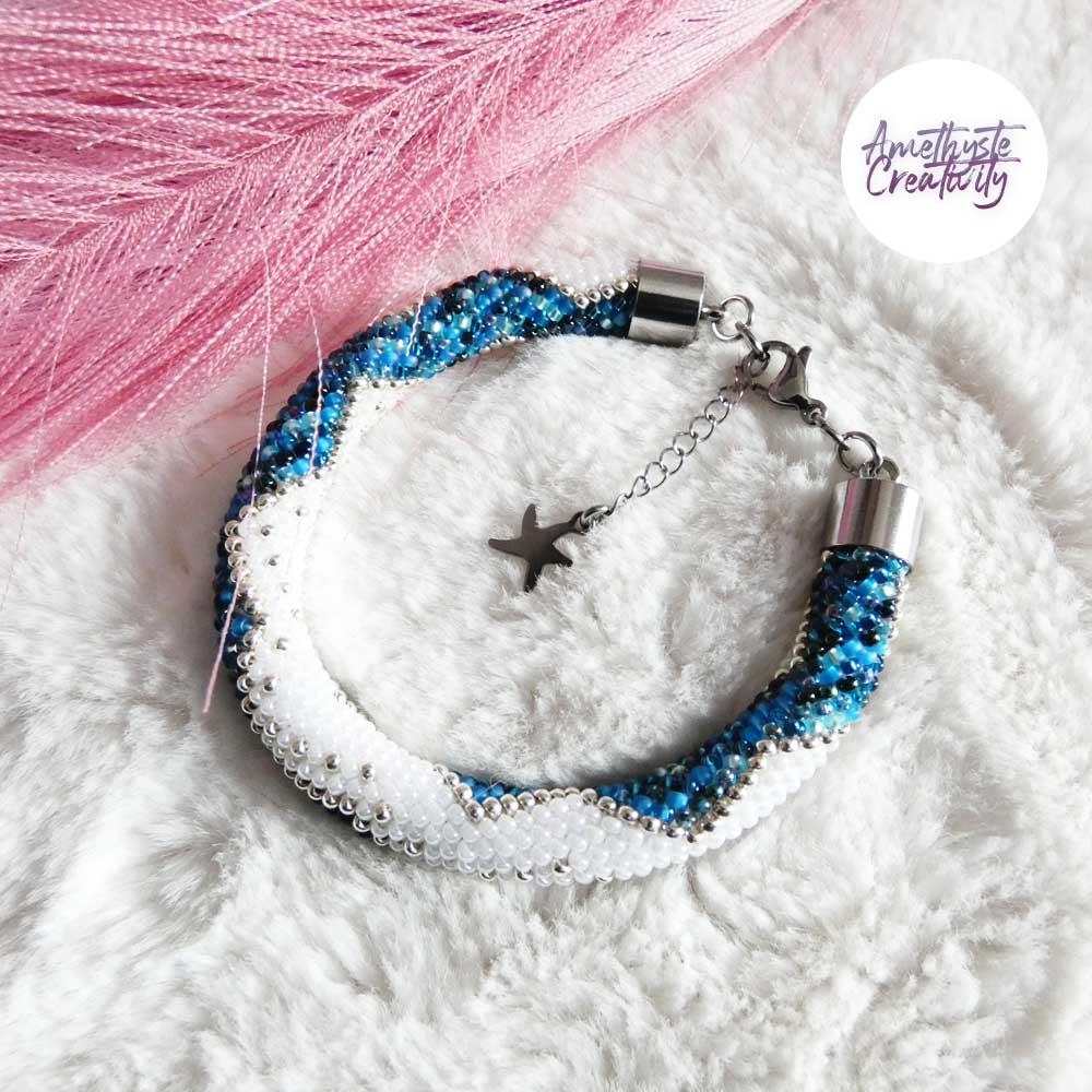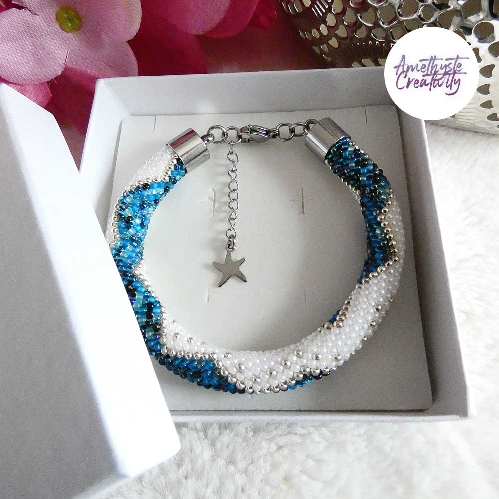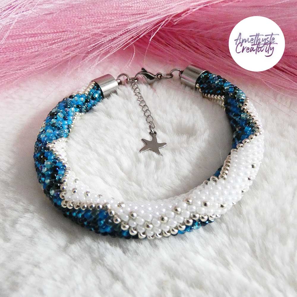 Il s’agit d’un bracelet spirale réalisé au crochet avec des perles japonaises « Miyuki » de taille 11/0 (2 mm). Chaque perle est soigneusement crochetée à la main, ce qui confère au bracelet à la fois solidité et souplesse.