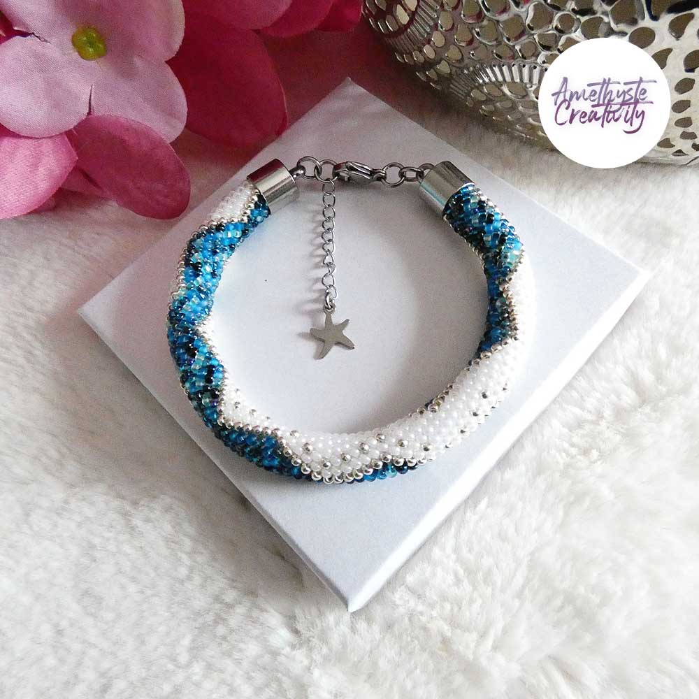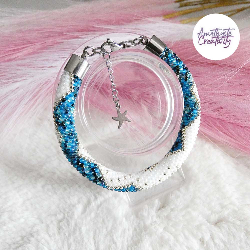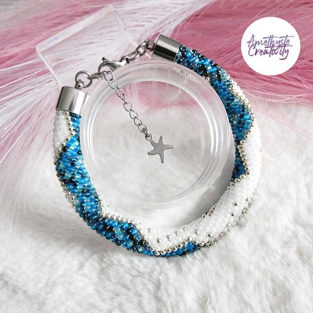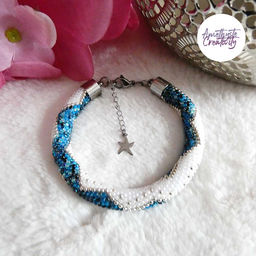 Il s’agit d’un bracelet spirale réalisé au crochet avec des perles japonaises « Miyuki » de taille 11/0 (2 mm). Chaque perle est soigneusement crochetée à la main, ce qui confère au bracelet à la fois solidité et souplesse.