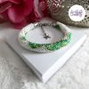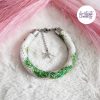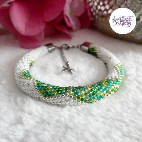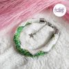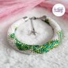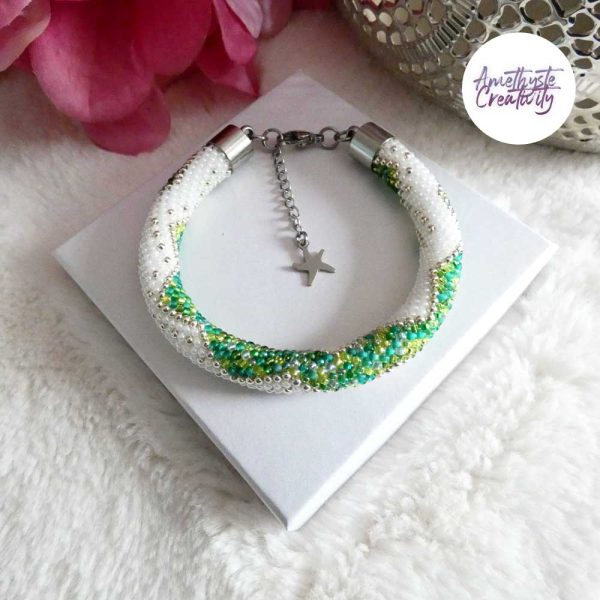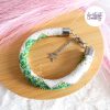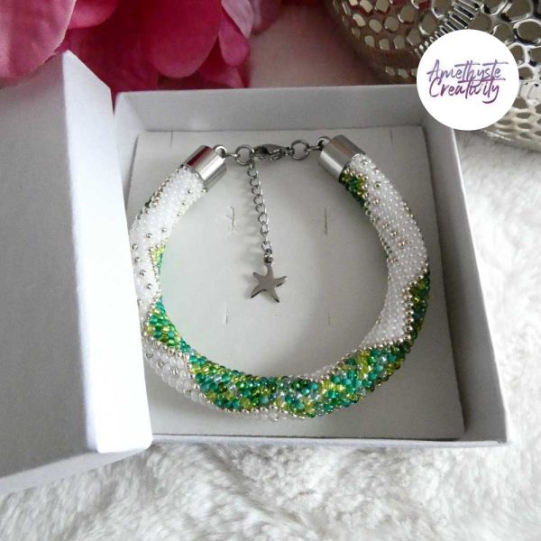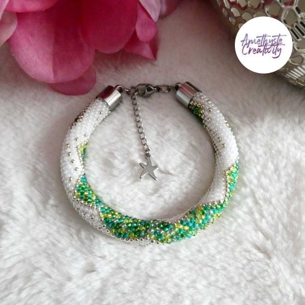 CHIC & ELEGANCE || Bracelet Crocheté Fait Main En Acier Inoxydable Et Perles “Miyuki” – Argenté, Blanc nacré & Vert