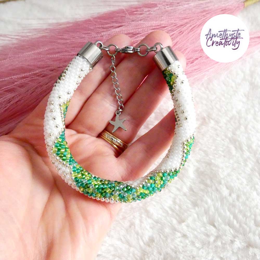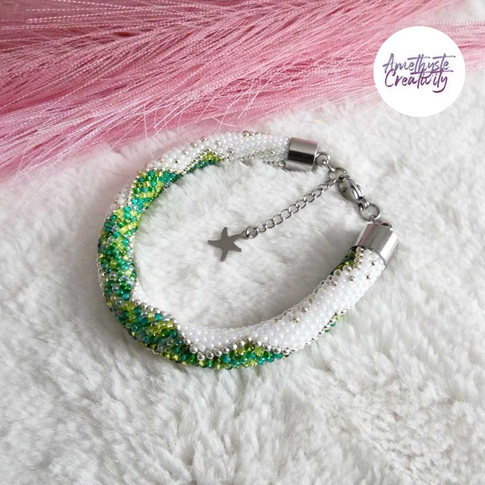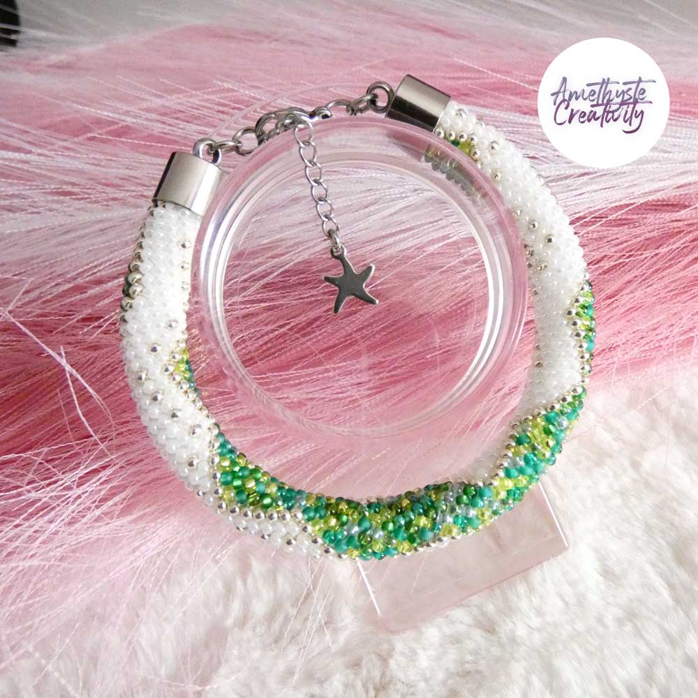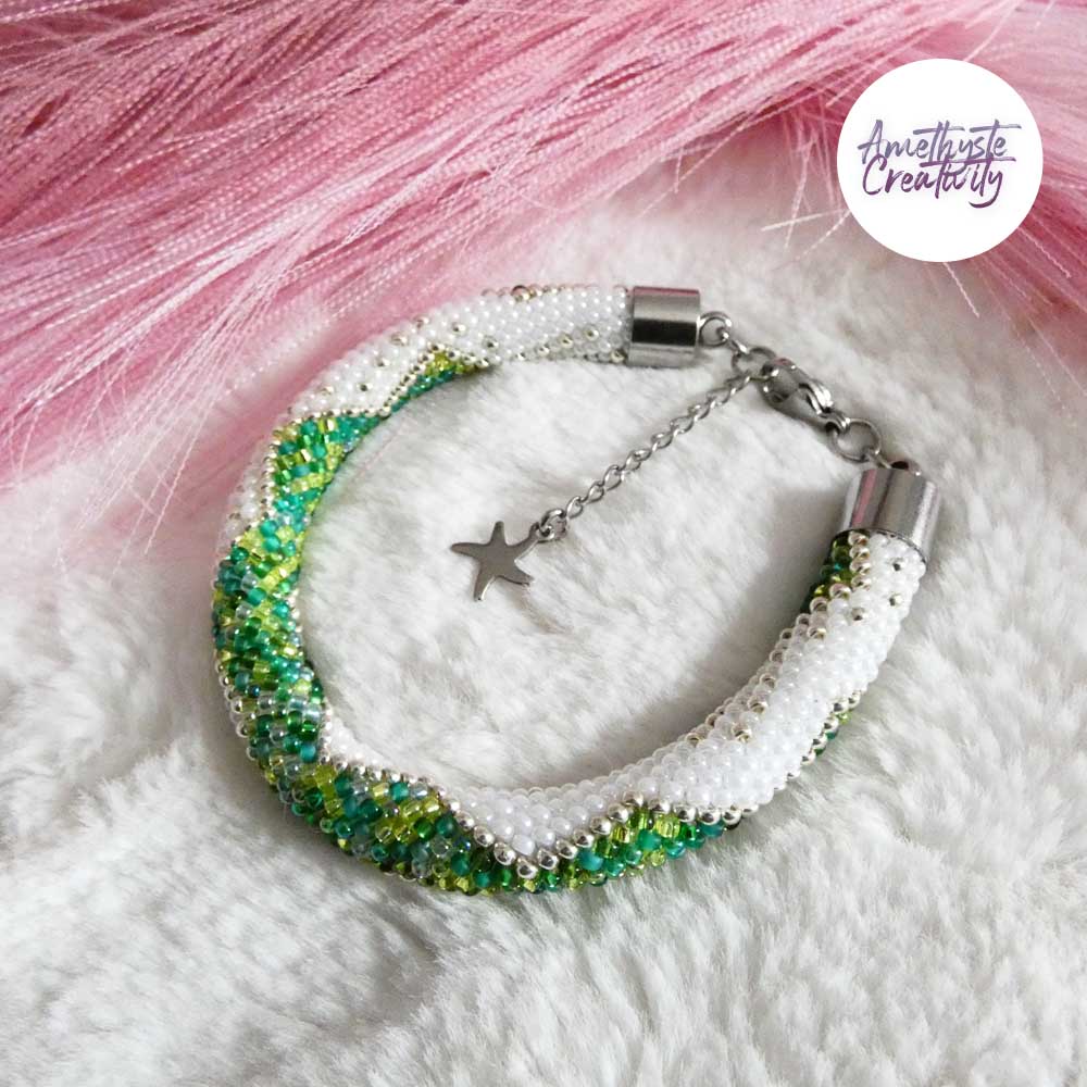 CHIC & ELEGANCE || Bracelet Crocheté Fait Main En Acier Inoxydable Et Perles “Miyuki” – Argenté, Blanc nacré & Vert