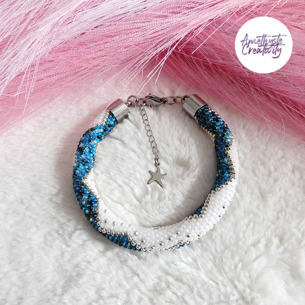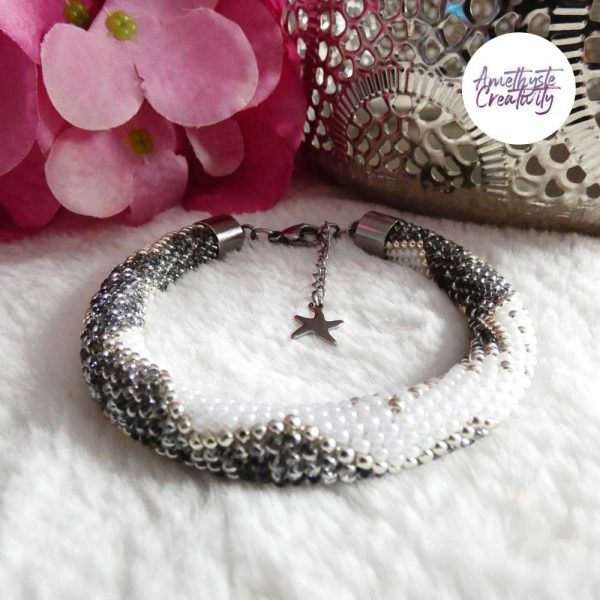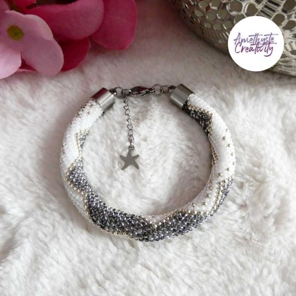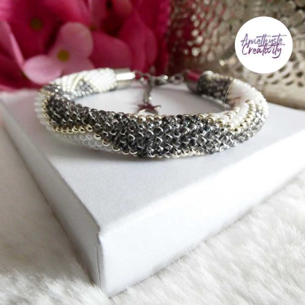 Il s’agit d’un bracelet spirale réalisé au crochet avec des perles japonaises « Miyuki » de taille 11/0 (2 mm). Chaque perle est soigneusement crochetée à la main, ce qui confère au bracelet à la fois solidité et souplesse.