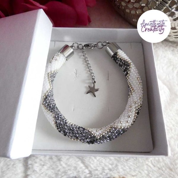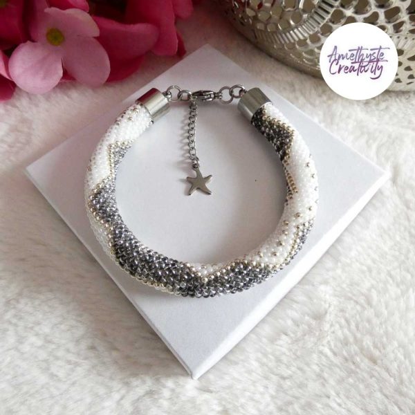 Ce bracelet, à la fois chic et élégant, est parfait pour sublimer vos tenues lors des fêtes. Créé avec soin par mes mains, il est accompagné de son schéma (Design by Amethyste Creativity, reproduction interdite).