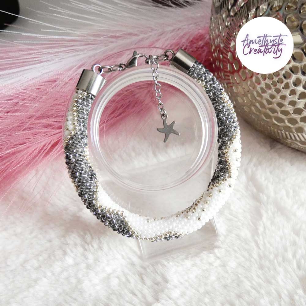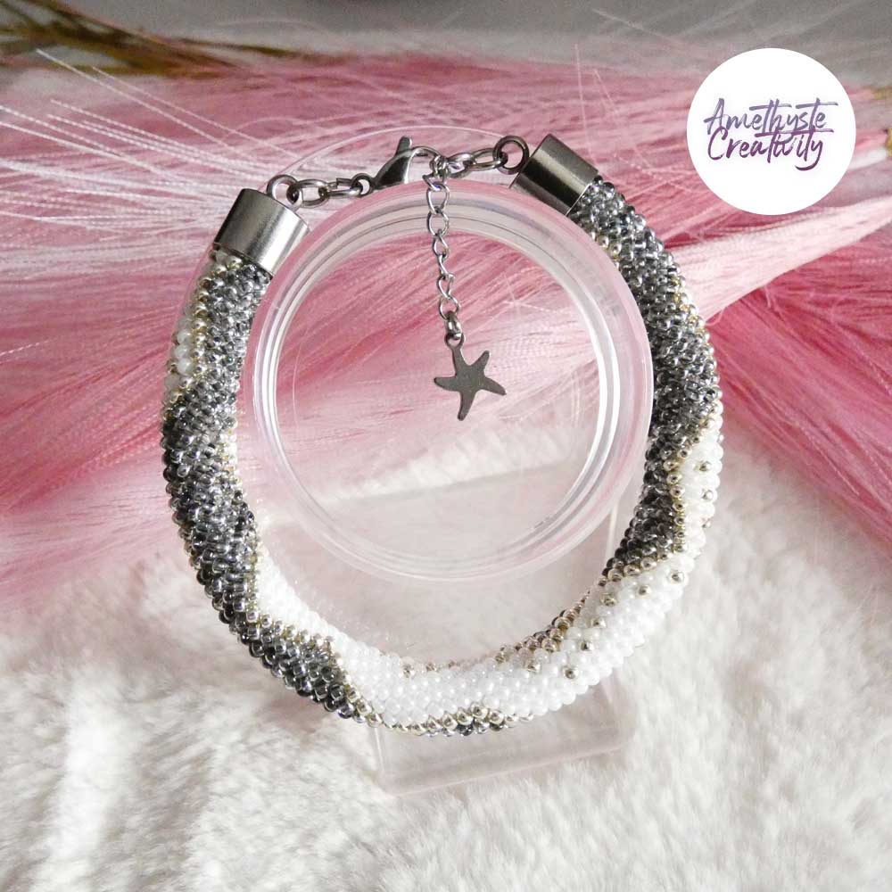 Il s’agit d’un bracelet spirale réalisé au crochet avec des perles japonaises « Miyuki » de taille 11/0 (2 mm). Chaque perle est soigneusement crochetée à la main, ce qui confère au bracelet à la fois solidité et souplesse.