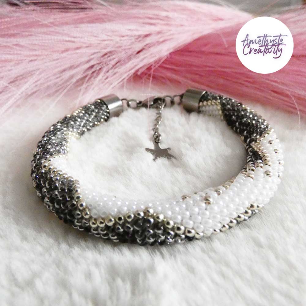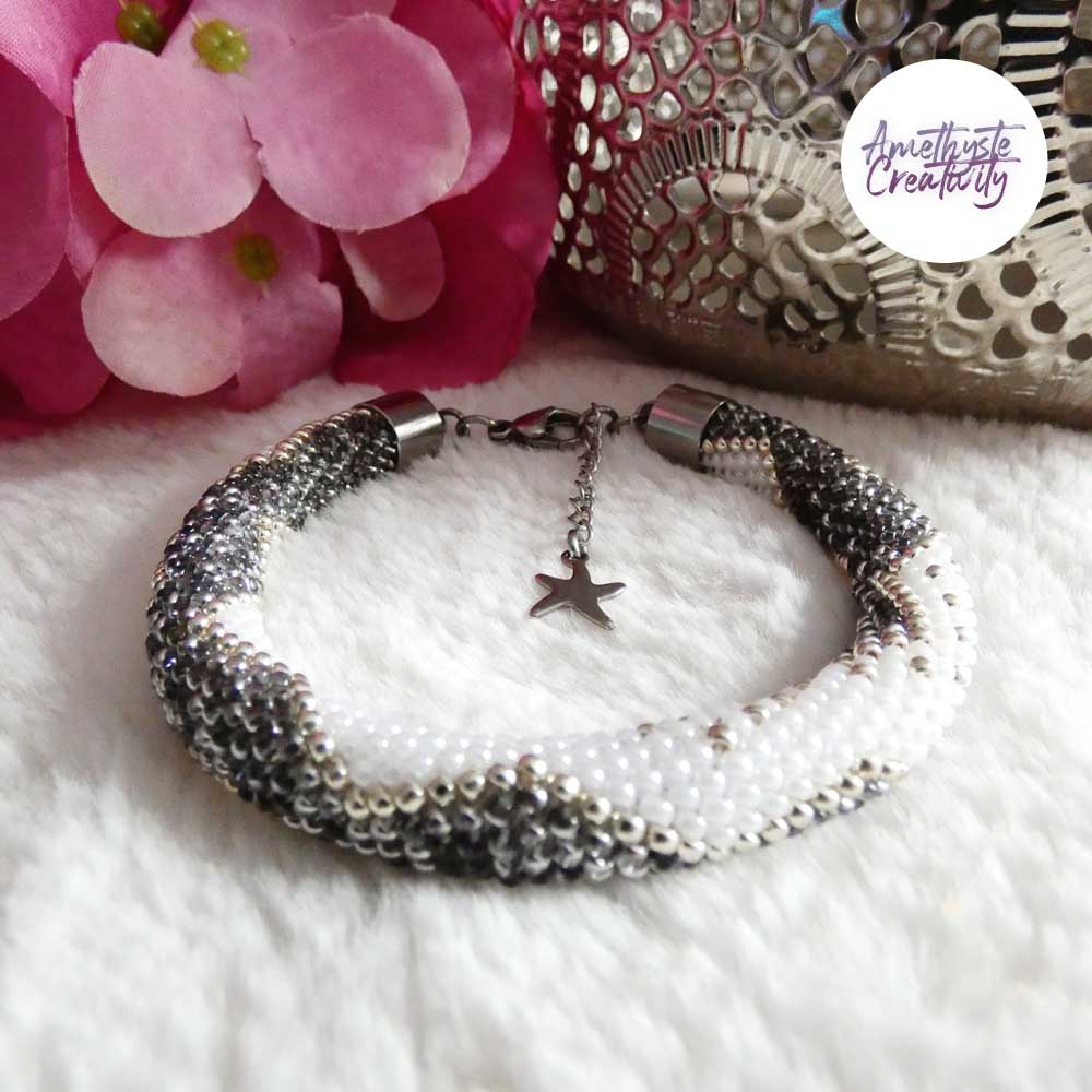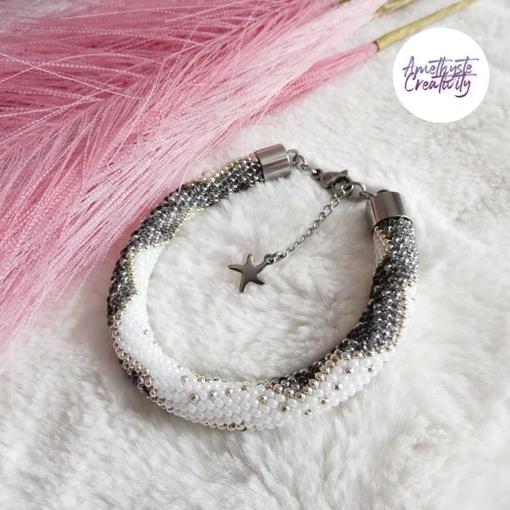 Ce bracelet, à la fois chic et élégant, est parfait pour sublimer vos tenues lors des fêtes. Créé avec soin par mes mains, il est accompagné de son schéma (Design by Amethyste Creativity, reproduction interdite).