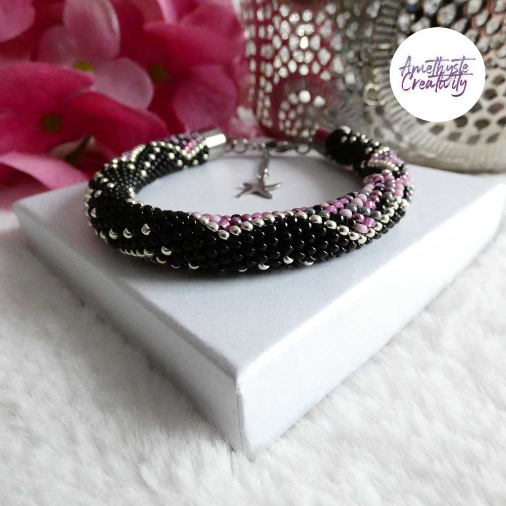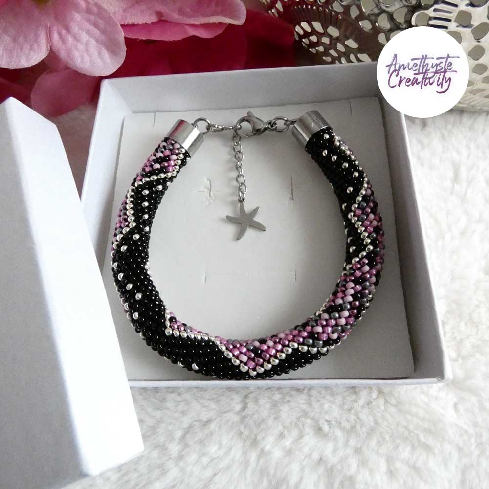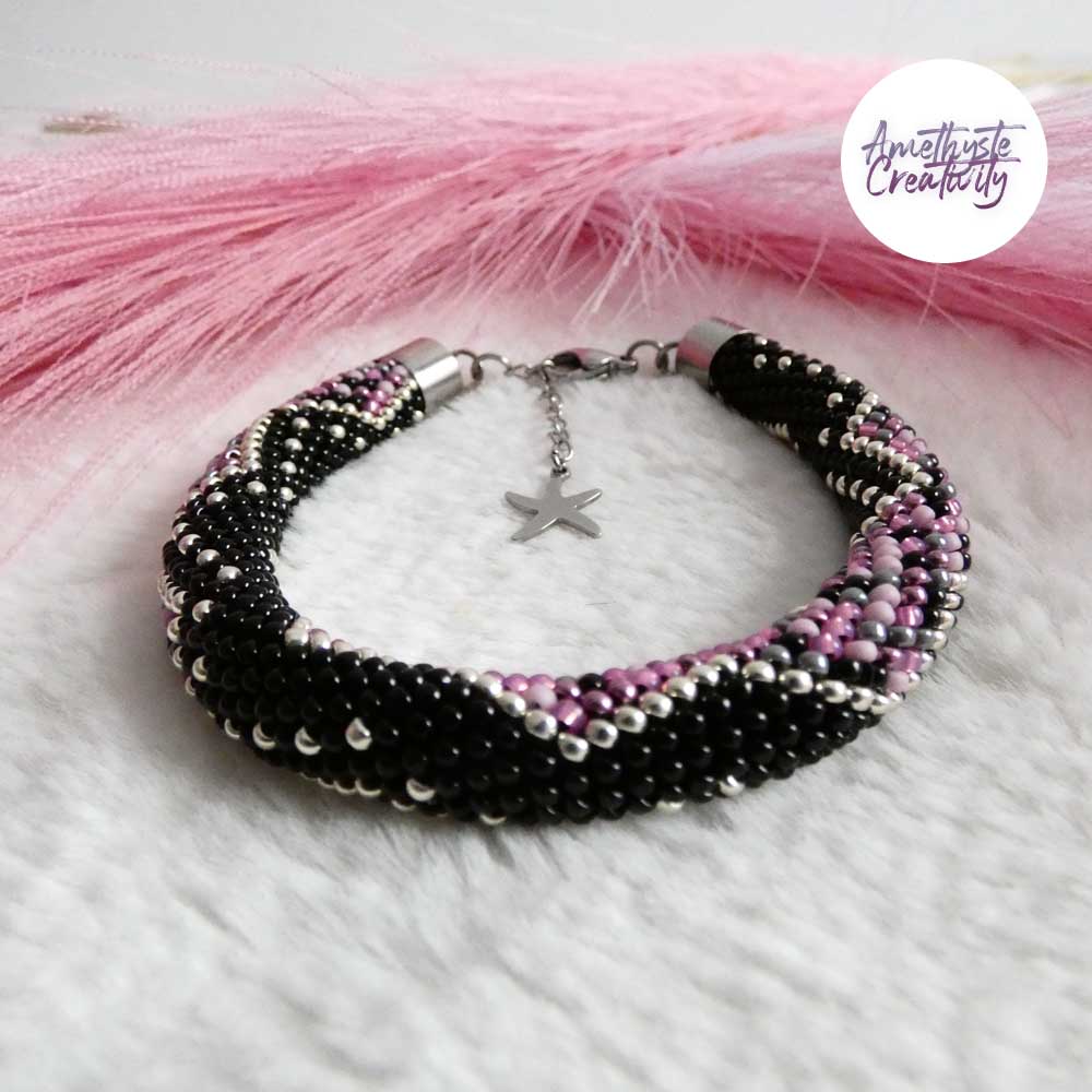 Un bracelet délicatement crocheté en spirale avec des perles japonaises Miyuki 11/0, mêlant le mix Pink Candy à la profondeur du noir et à l’éclat de l’argenté