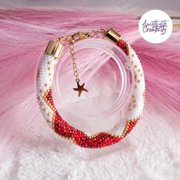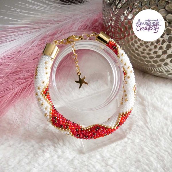 Il s’agit d’un bracelet spirale réalisé au crochet avec des perles japonaises « Miyuki » de taille 11/0 (2 mm). Chaque perle est soigneusement crochetée à la main, ce qui confère au bracelet à la fois solidité et souplesse.