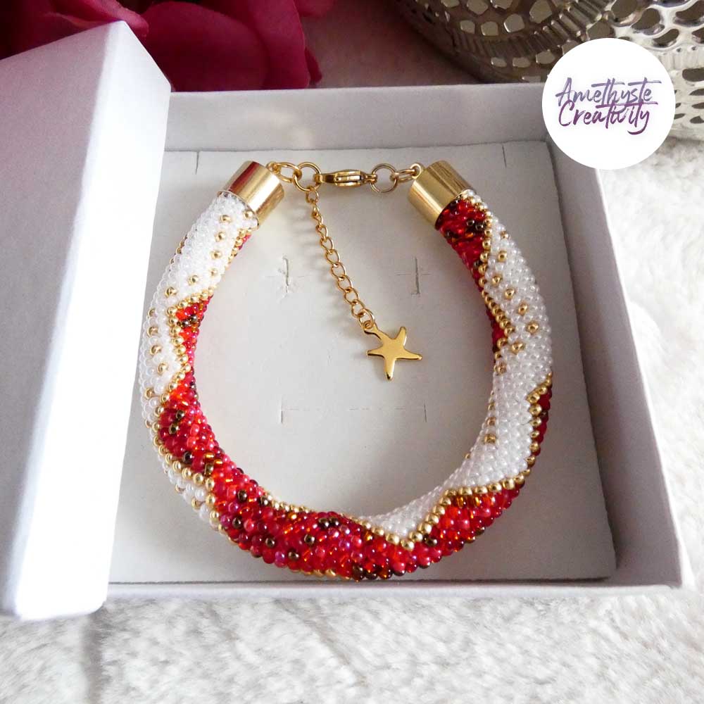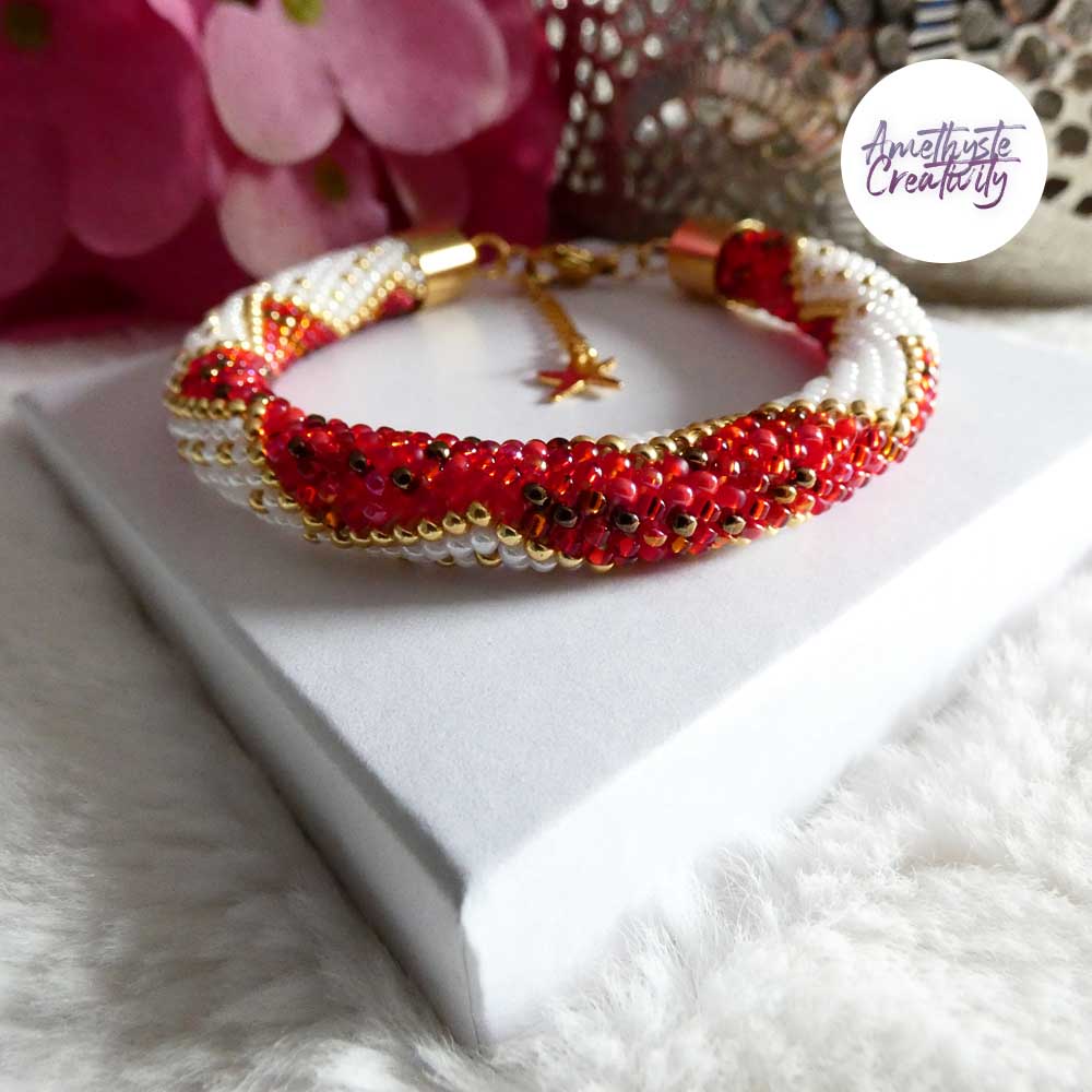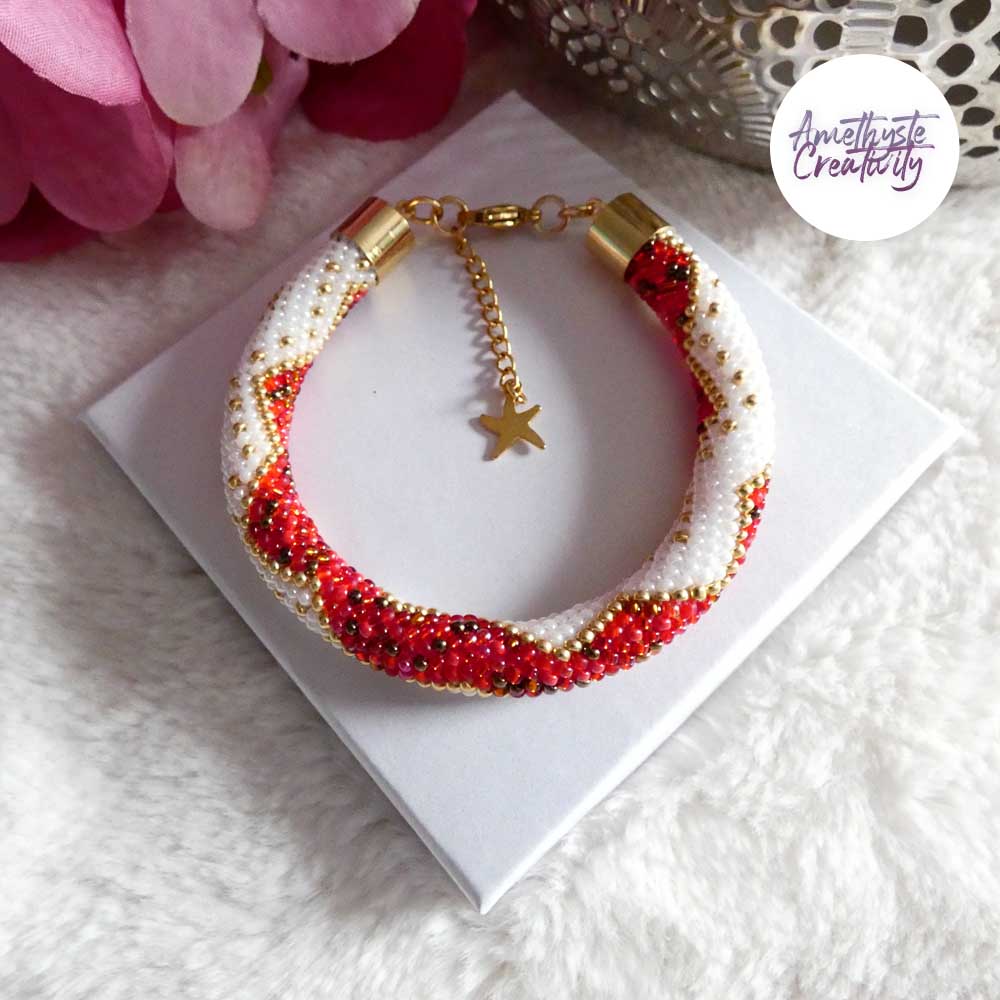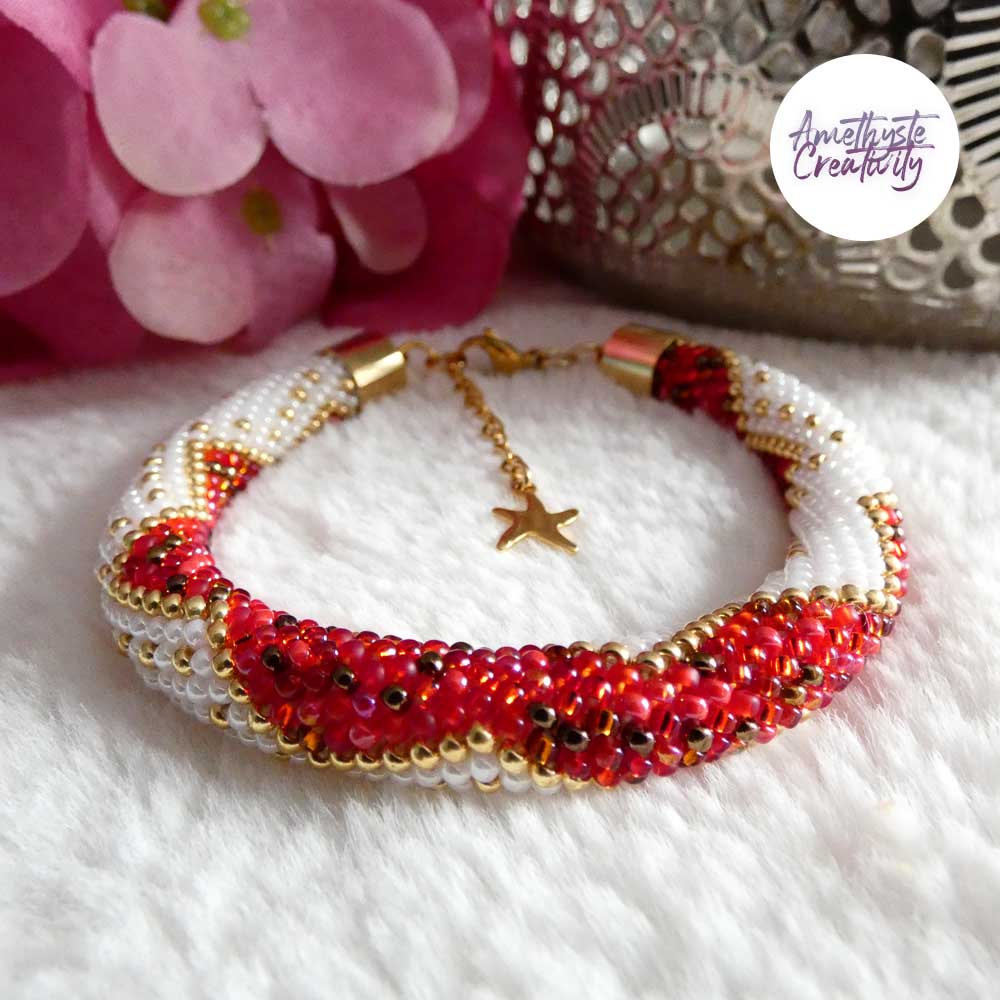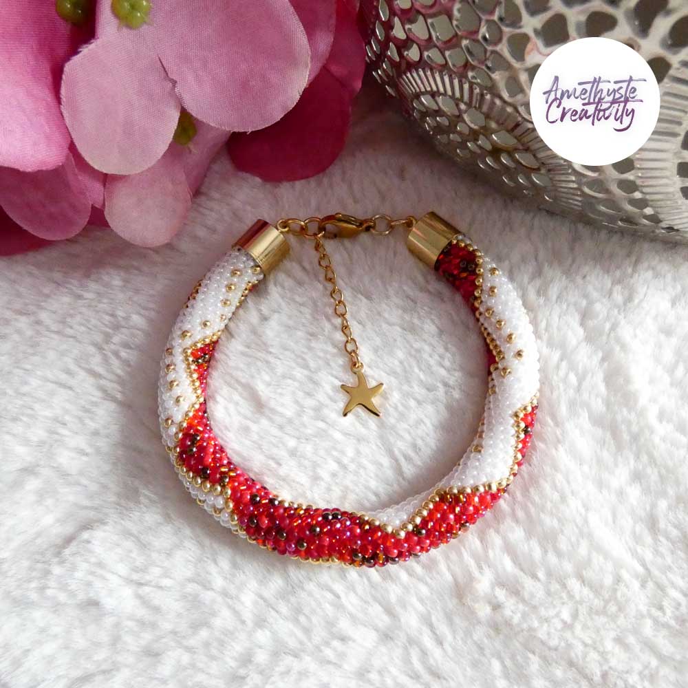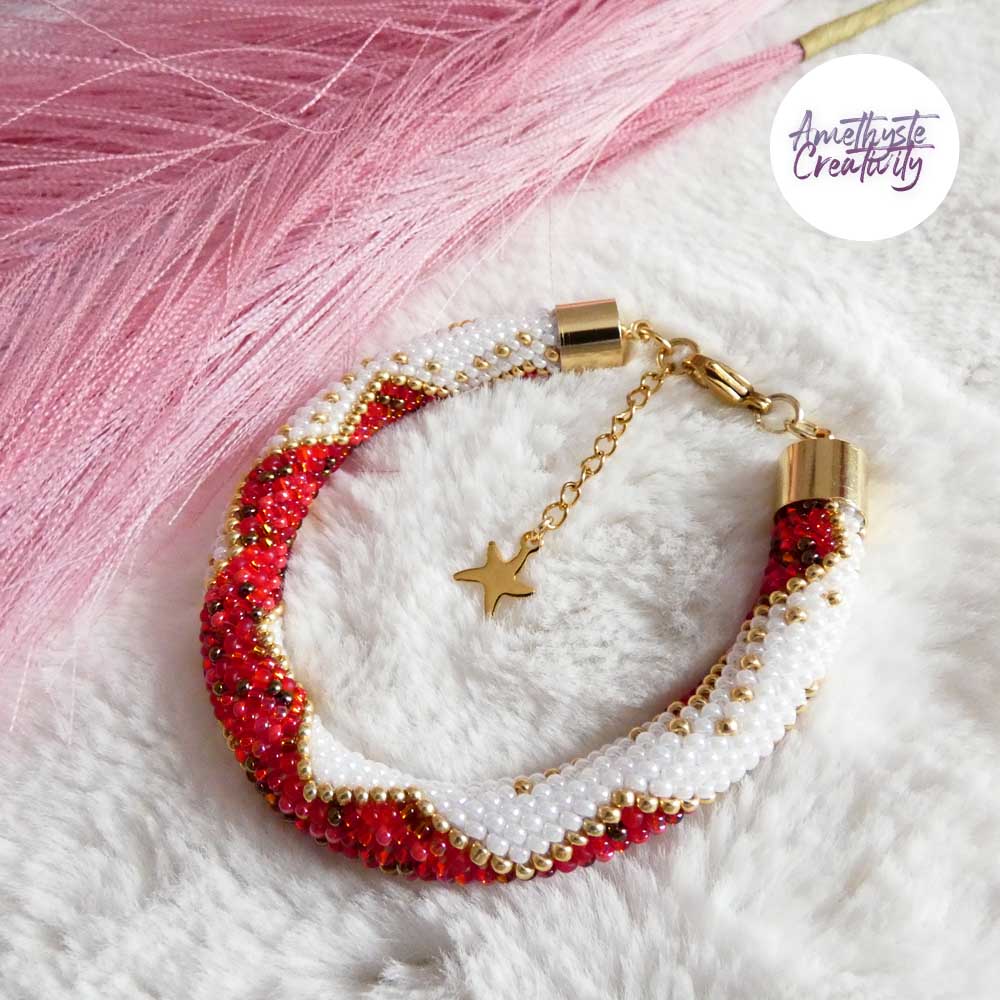Ce bracelet, à la fois chic et élégant, est parfait pour sublimer vos tenues lors des fêtes. Créé avec soin par mes mains, il est accompagné de son schéma (Design by Amethyste Creativity, reproduction interdite).