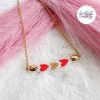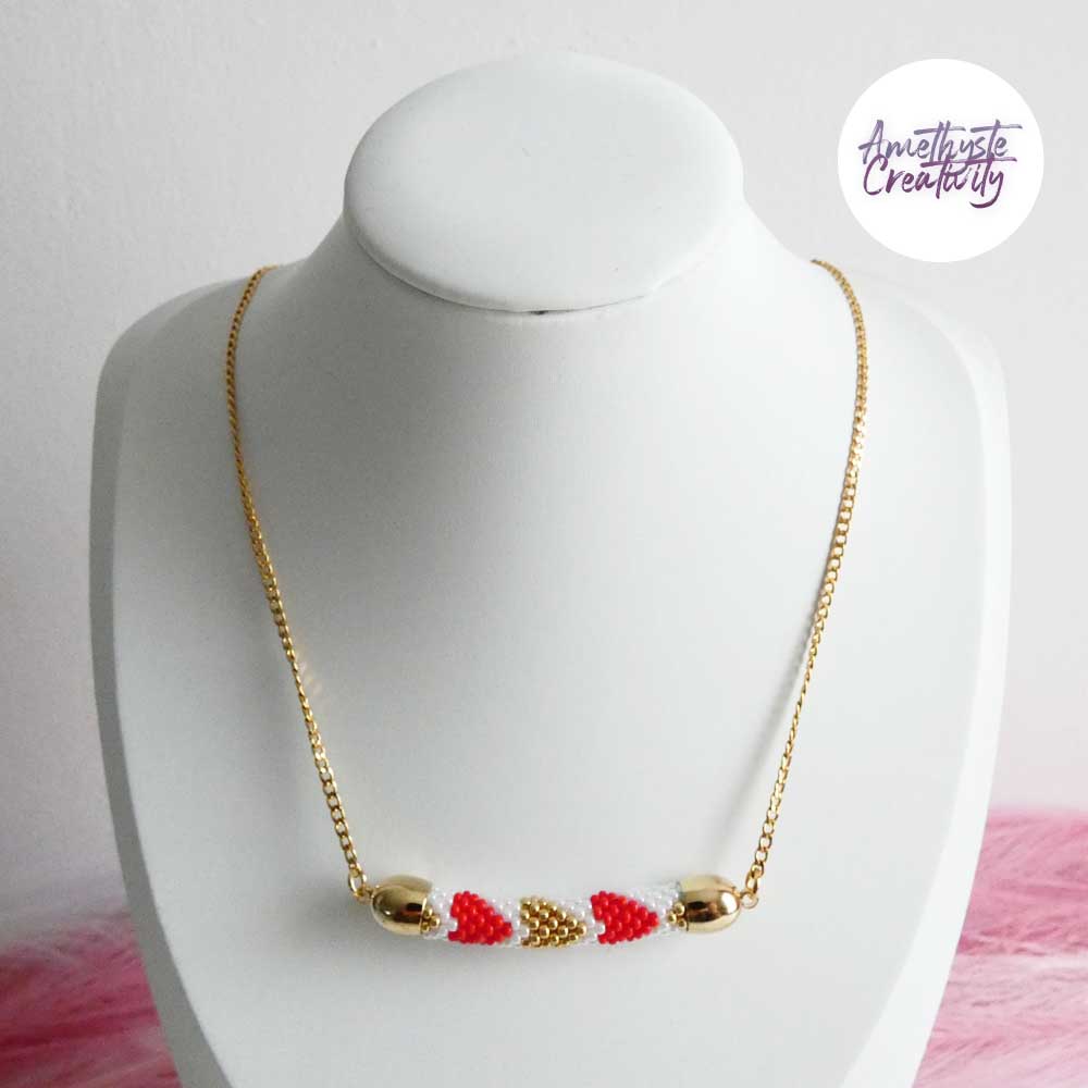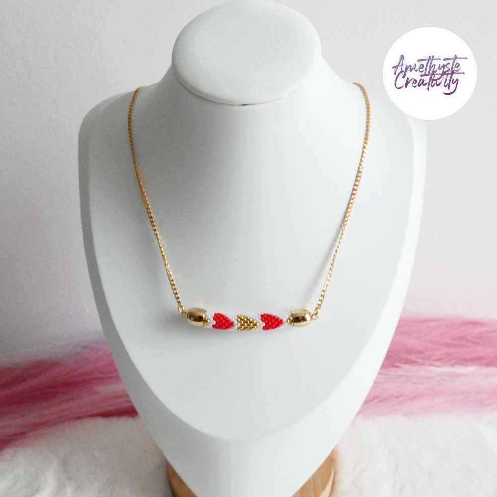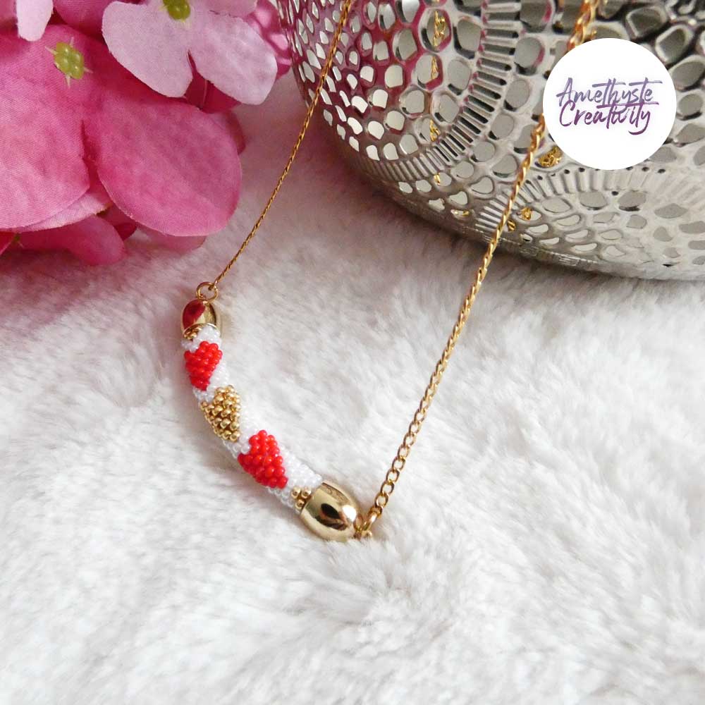 Découvrez la délicatesse du collier Valentina, un bijou empreint de douceur et de symbolique. Son pendentif est crocheté à la main avec de fines perles japonaises Miyuki, formant trois petits cœurs : deux rouges encadrant un cœur doré au centre, symbole d’amour et d’harmonie.