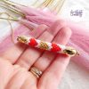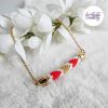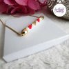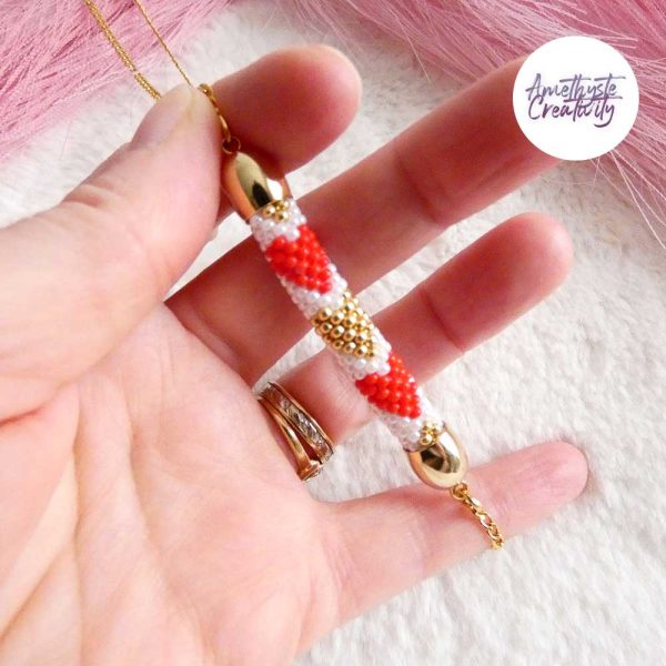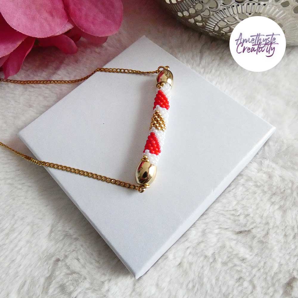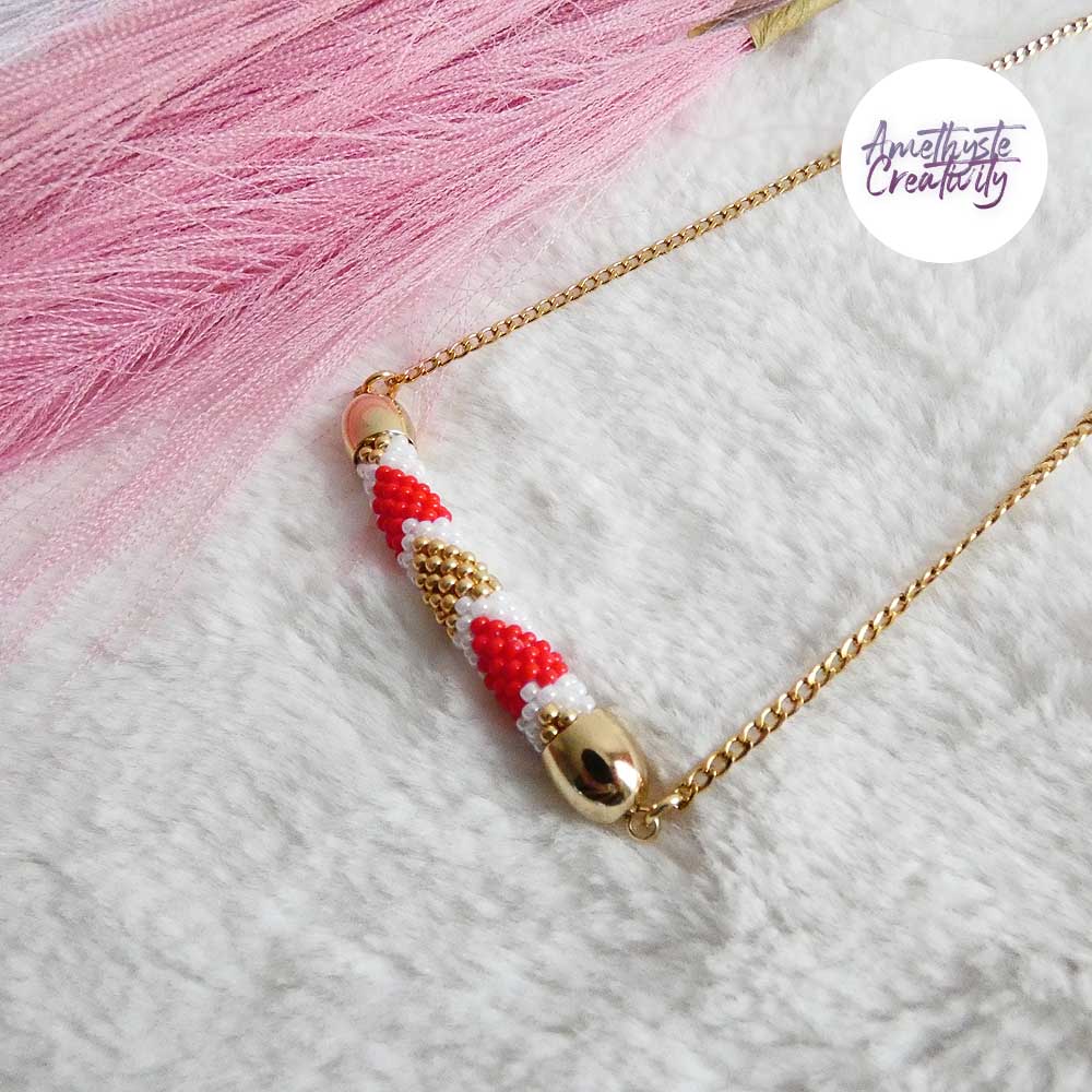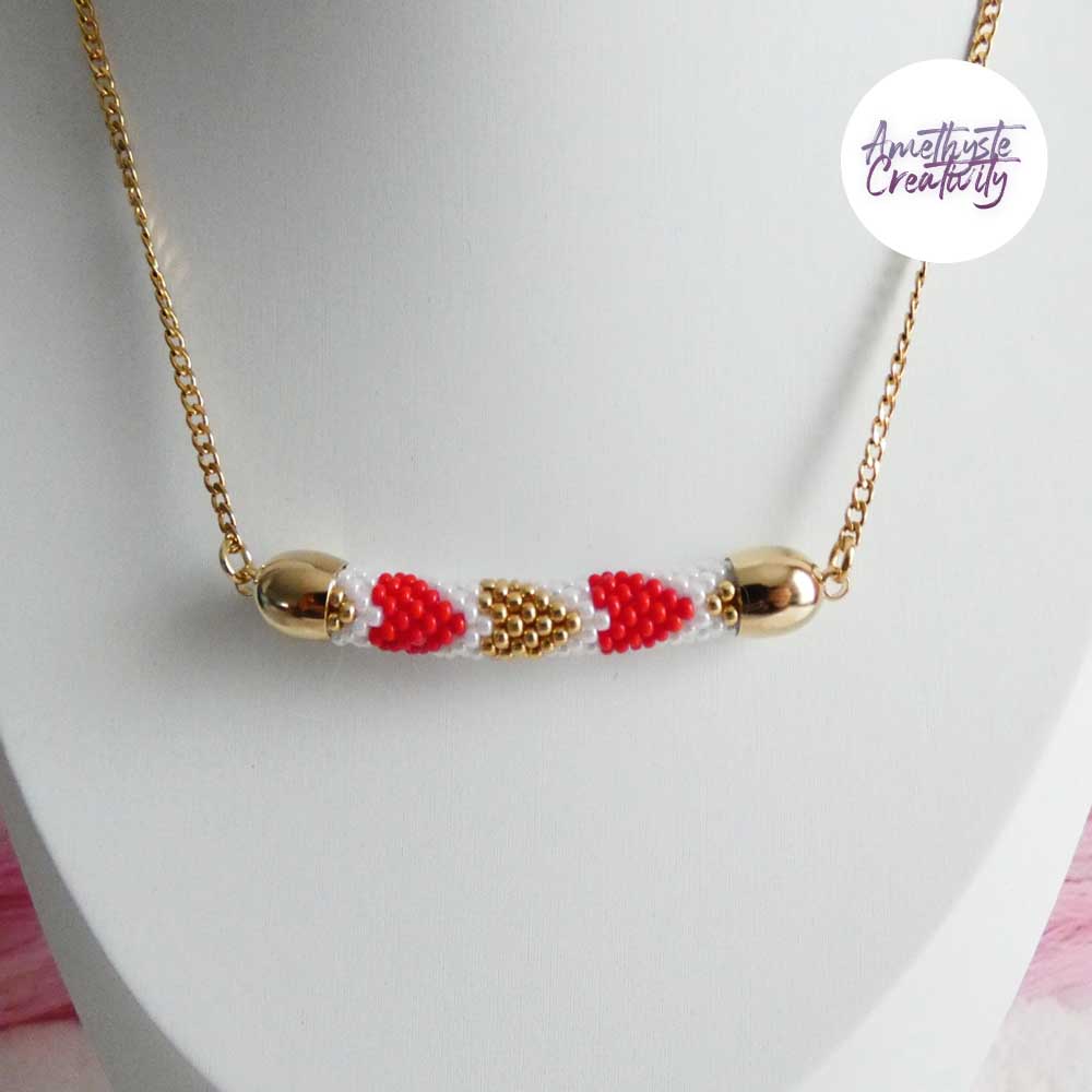 Découvrez la délicatesse du collier Valentina, un bijou empreint de douceur et de symbolique. Son pendentif est crocheté à la main avec de fines perles japonaises Miyuki, formant trois petits cœurs : deux rouges encadrant un cœur doré au centre, symbole d’amour et d’harmonie.