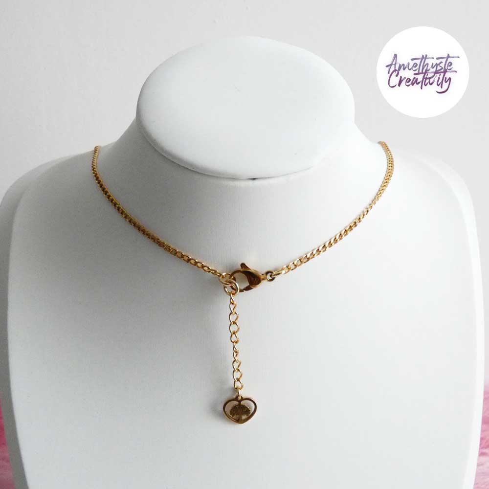 • Chaîne, fermoir, embouts et chaînette d’extension en acier inoxydable doré