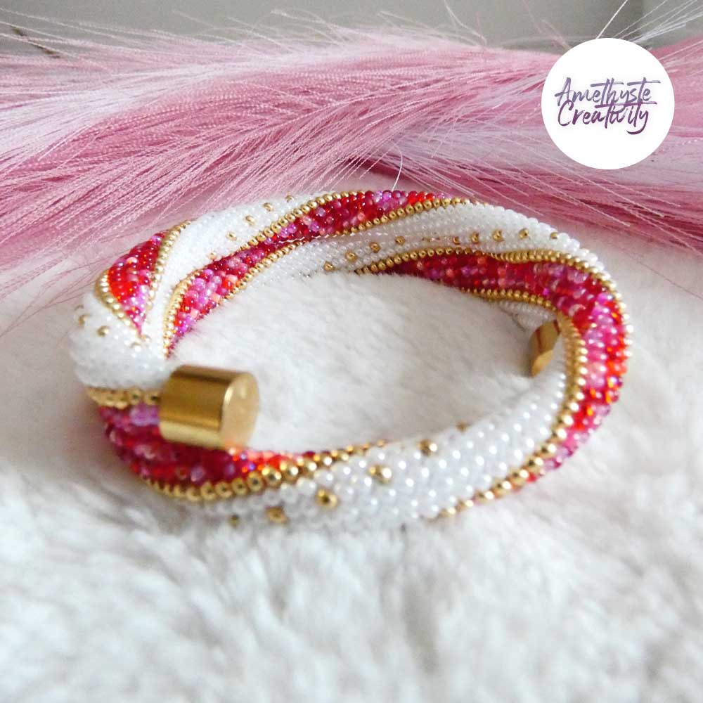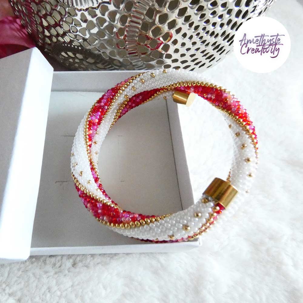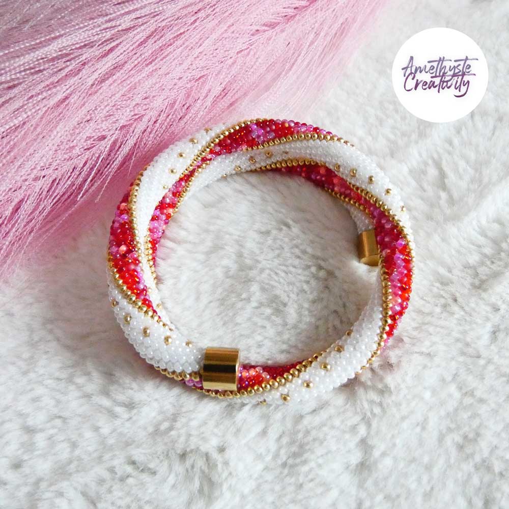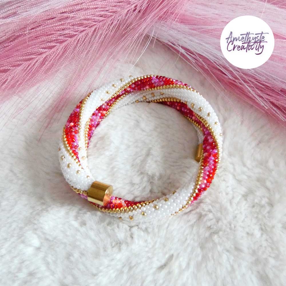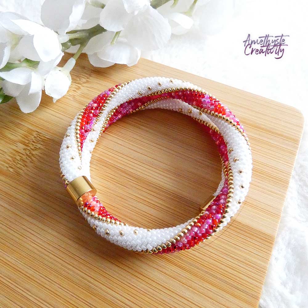 MINIMAL CHIC || Bracelet Mémoire Sans Fermoir Crocheté Fait Main en Perles « Miyuki » – Blanc Nacré & Mix Rose-Rouge