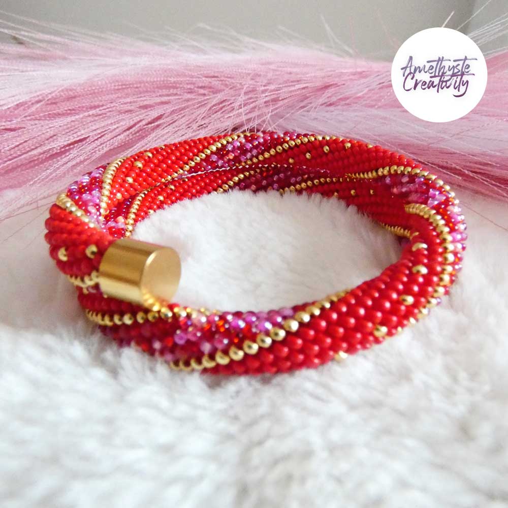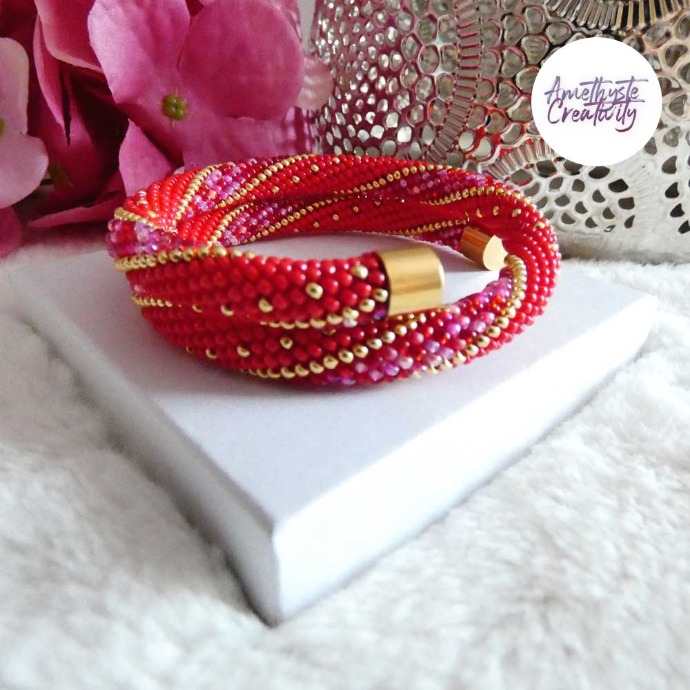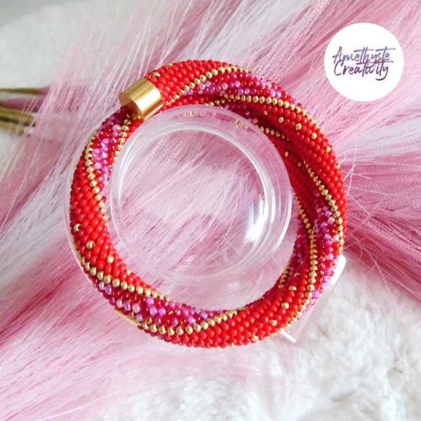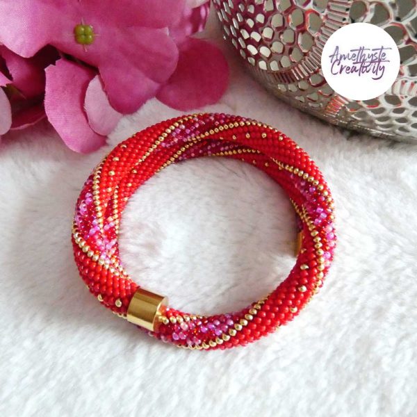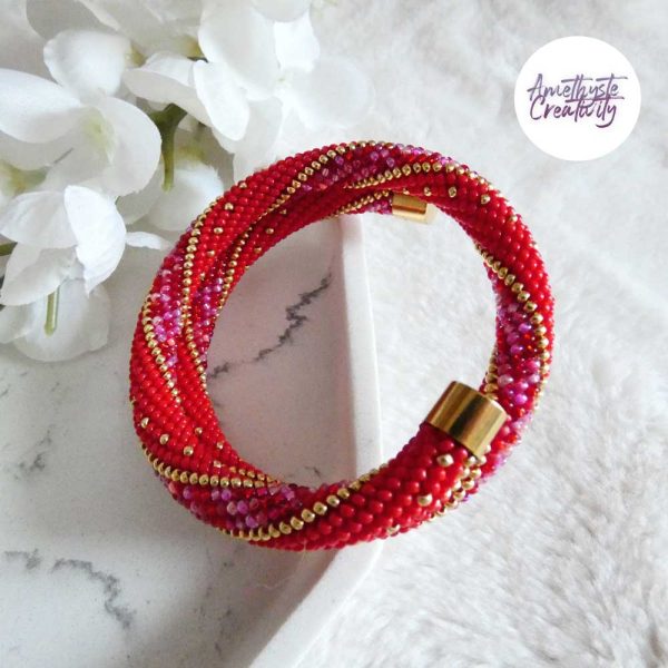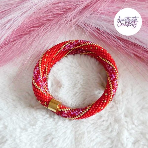 L’association du rouge intense, des nuances rose-rouge scintillantes et des reflets dorés apporte chaleur, élégance et caractère à ce bijou. Les touches dorées viennent illuminer l’ensemble et soulignent son style chic et lumineux. Chaque bracelet est réalisé avec soin, ce qui en fait une pièce unique.