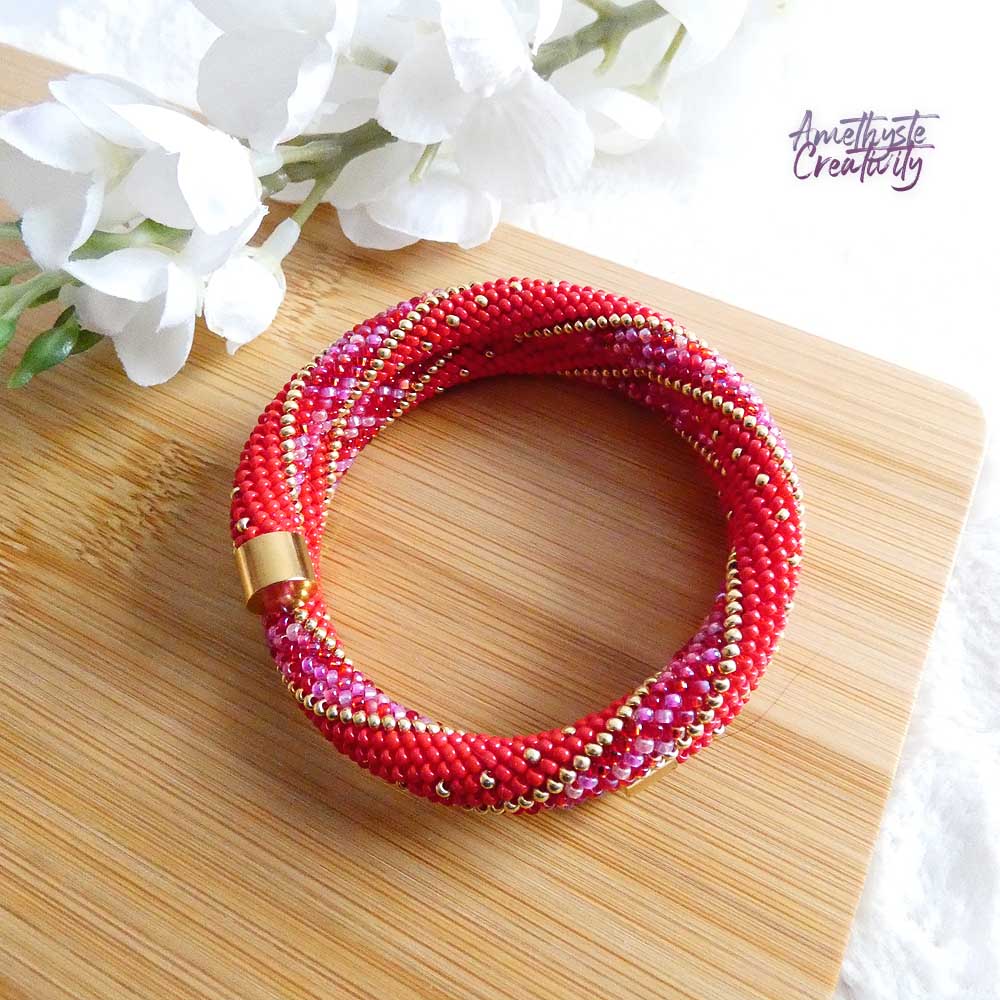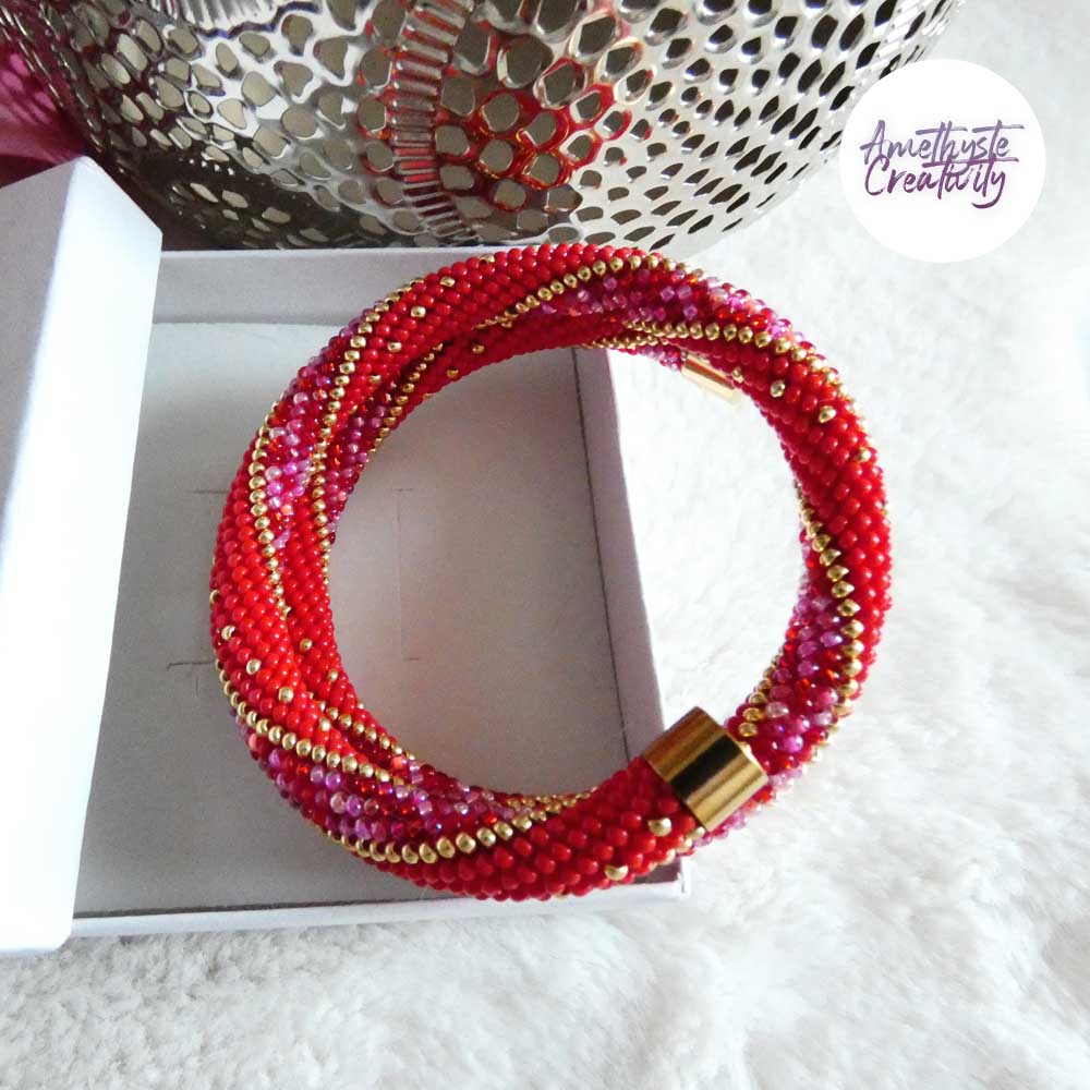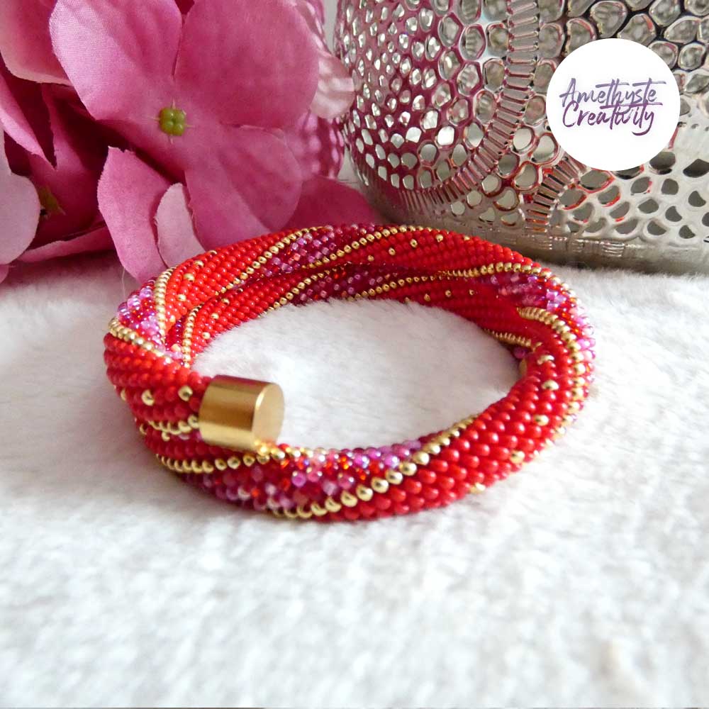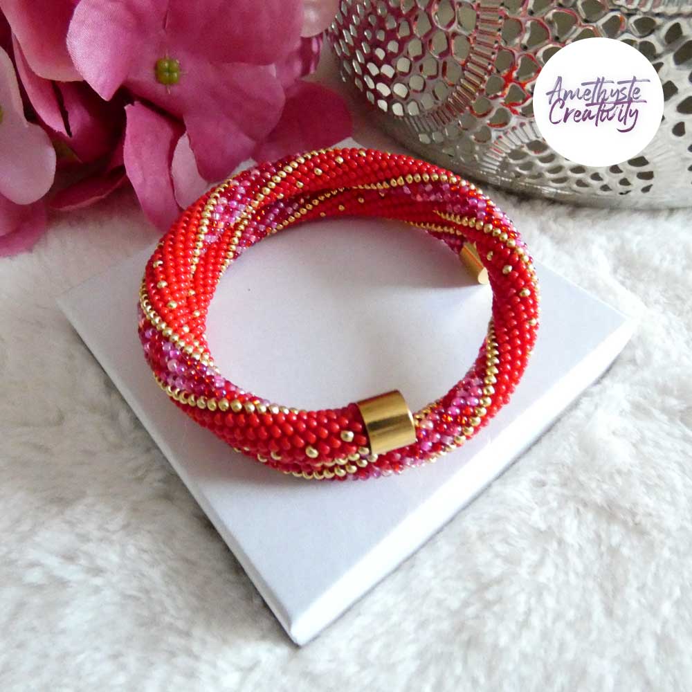 L’association du rouge intense, des nuances rose-rouge scintillantes et des reflets dorés apporte chaleur, élégance et caractère à ce bijou. Les touches dorées viennent illuminer l’ensemble et soulignent son style chic et lumineux. Chaque bracelet est réalisé avec soin, ce qui en fait une pièce unique.