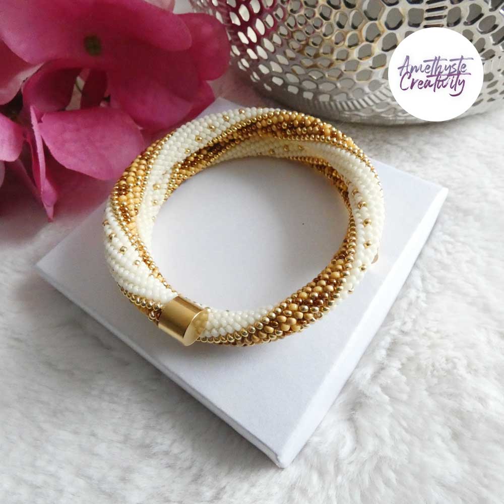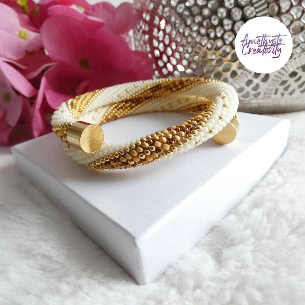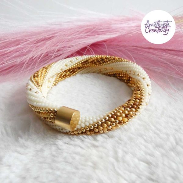Ce bracelet mémoire est entièrement crocheté à la main avec des perles japonaises Miyuki, reconnues pour leur finesse, leur régularité et leur éclat. Sa structure en spirale lui permet de s’enrouler naturellement autour du poignet, offrant un porté confortable et pratique, sans fermoir.