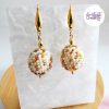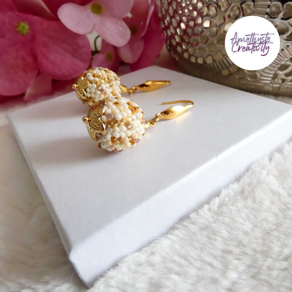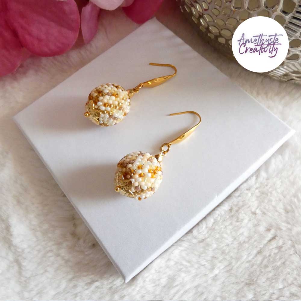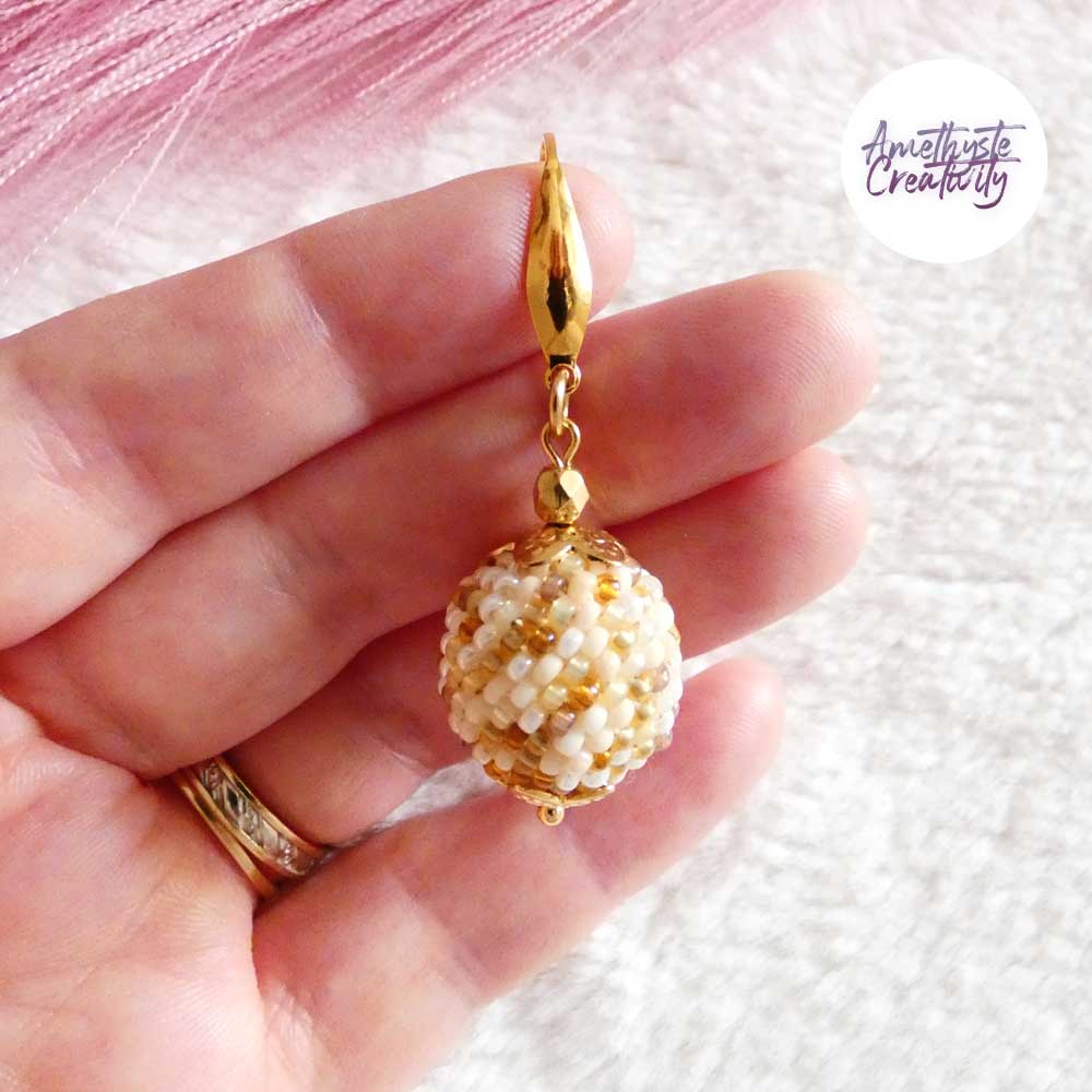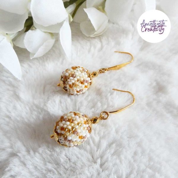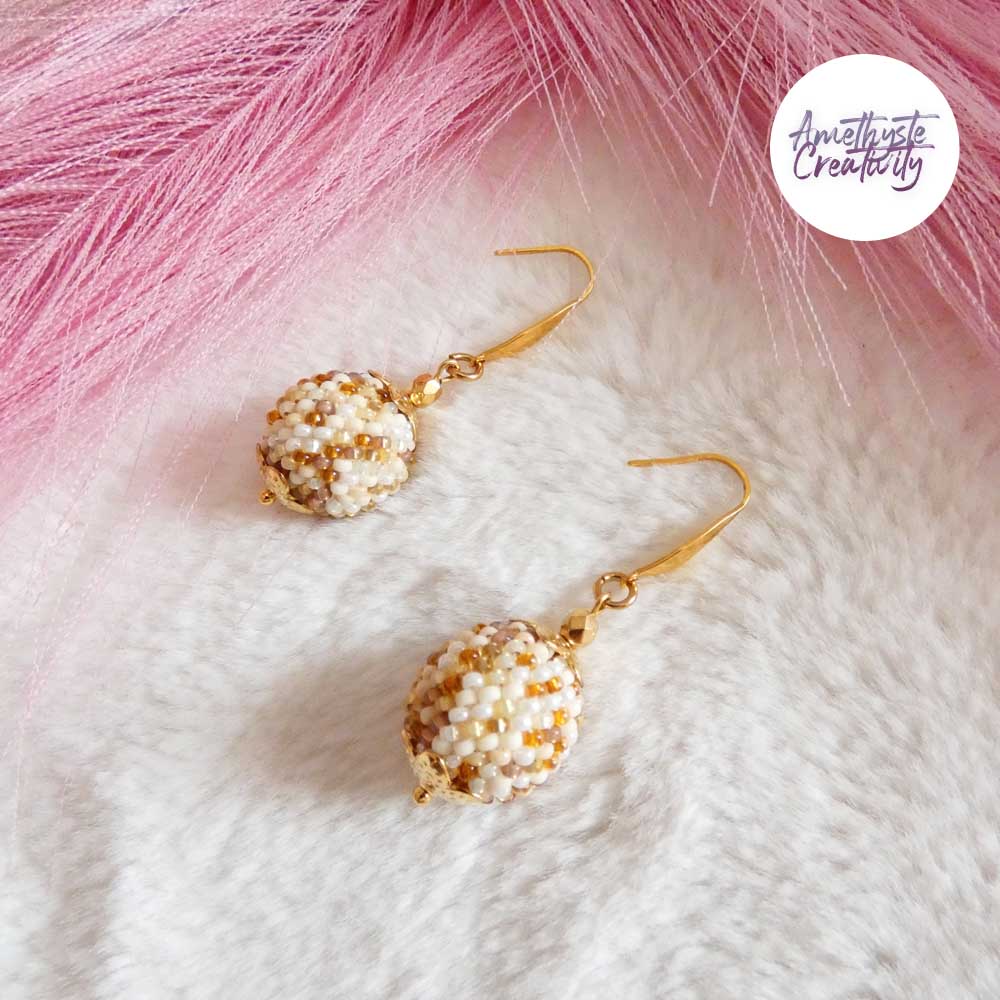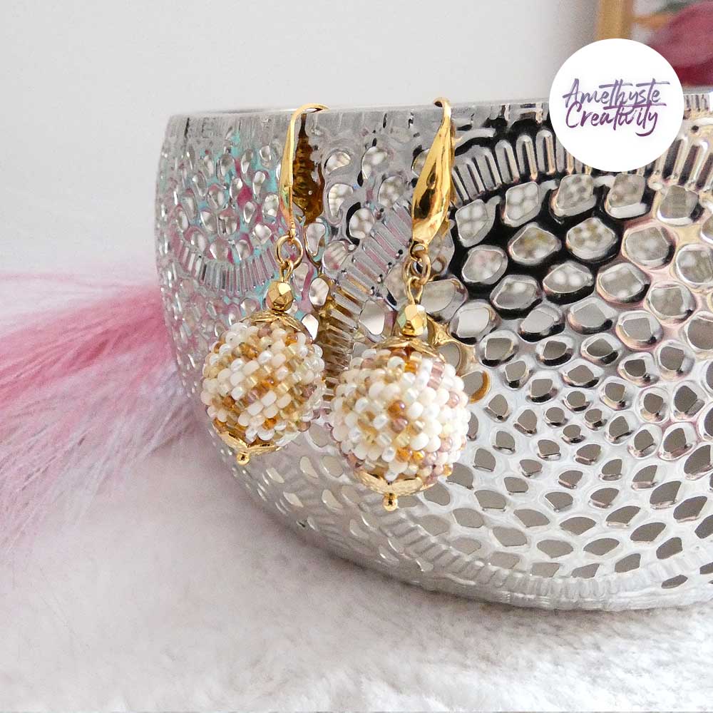 Je vous présente des Boucles d’oreilles en forme de boules réalisées au crochet avec des perles japonaise “Miyuki” de 11/0 (2mm). Ces boucles d’oreilles sont réalisées à la main par mes soins.