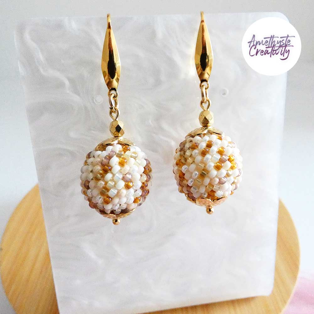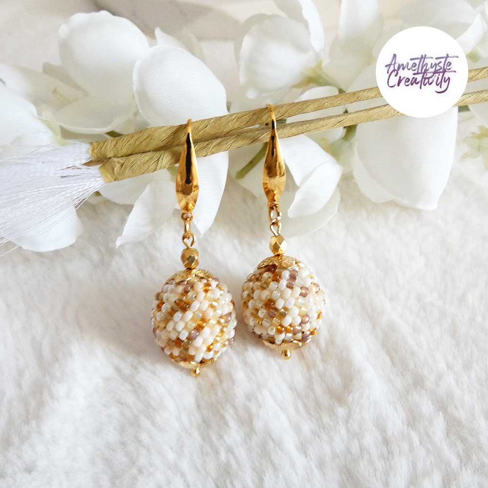SYRA || Boucles d’oreilles Crochetées Boules de 17 mm en Perles “Miyuki” et Acier Inoxydable – Beige