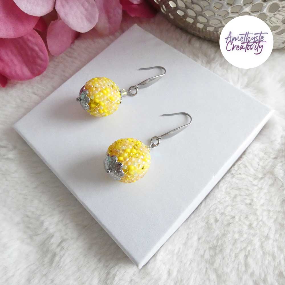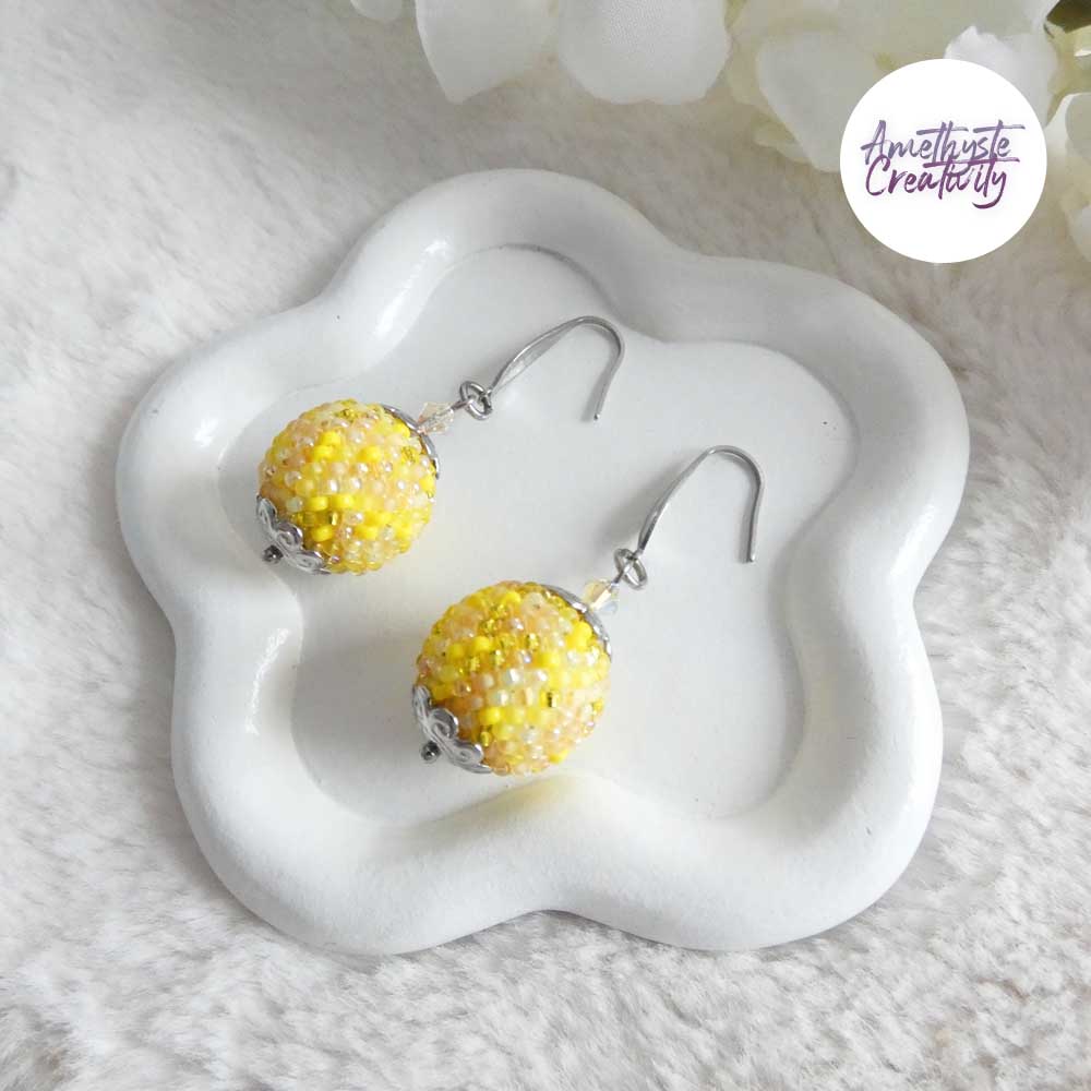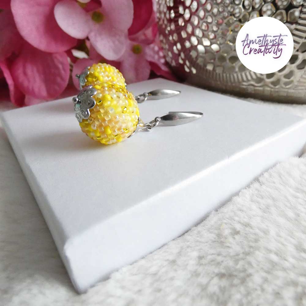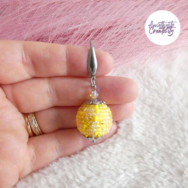 De délicates boules crochetées à la main, où les perles japonaises Miyuki 11/0 aux nuances Jaune Mix se mêlent avec harmonie.