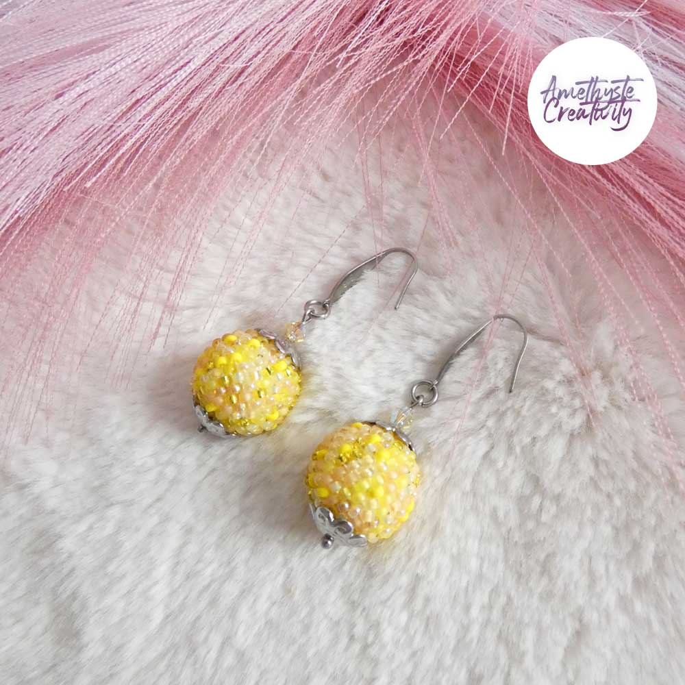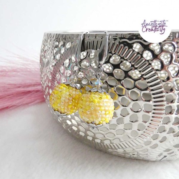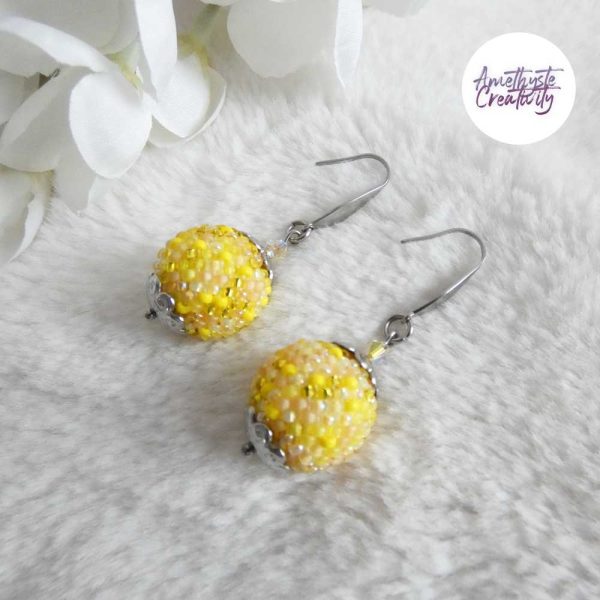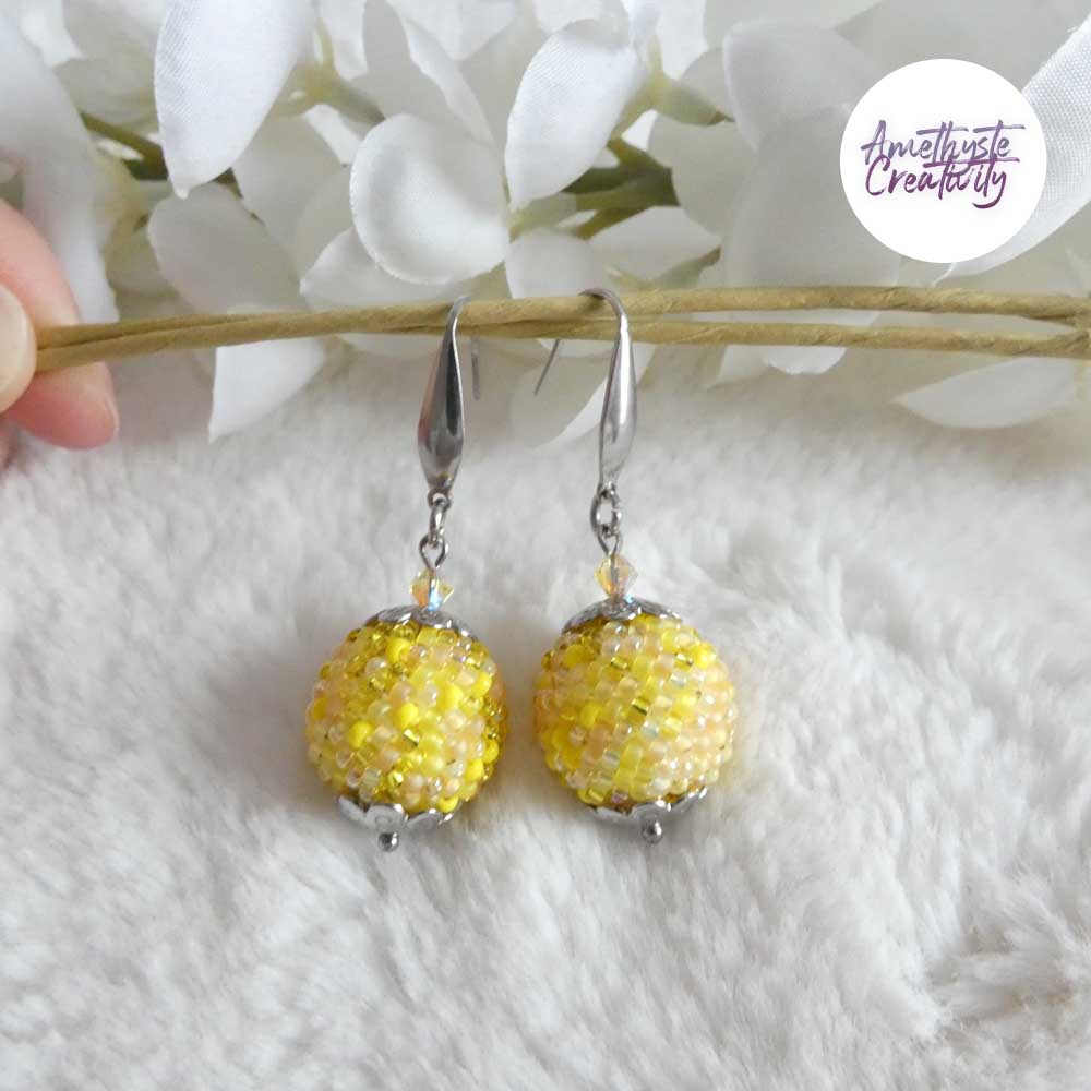 SYRA || Boucles d’oreilles Crochetées Boules de 17 mm en Perles “Miyuki” et Acier Inoxydable – Jaune Mix