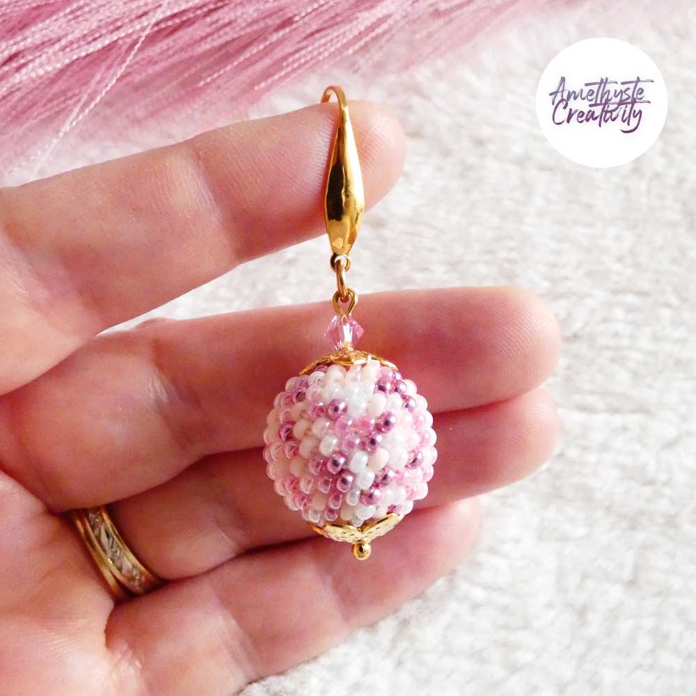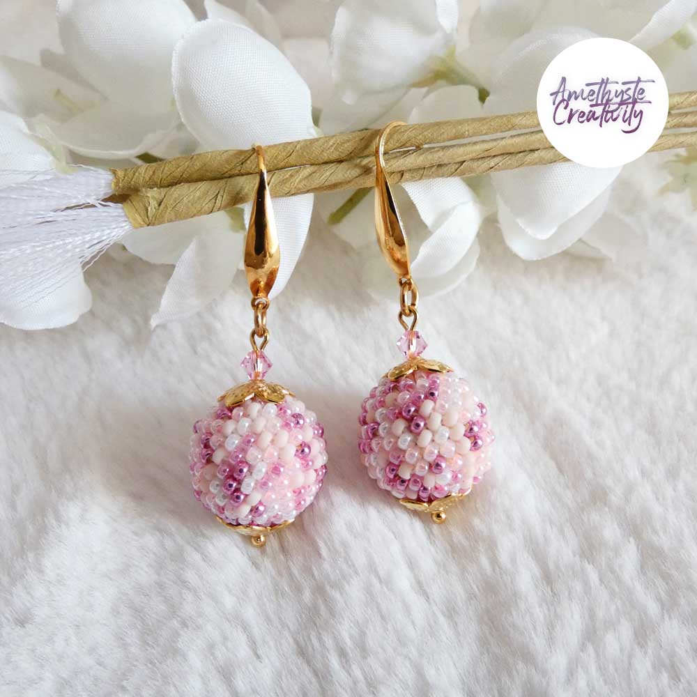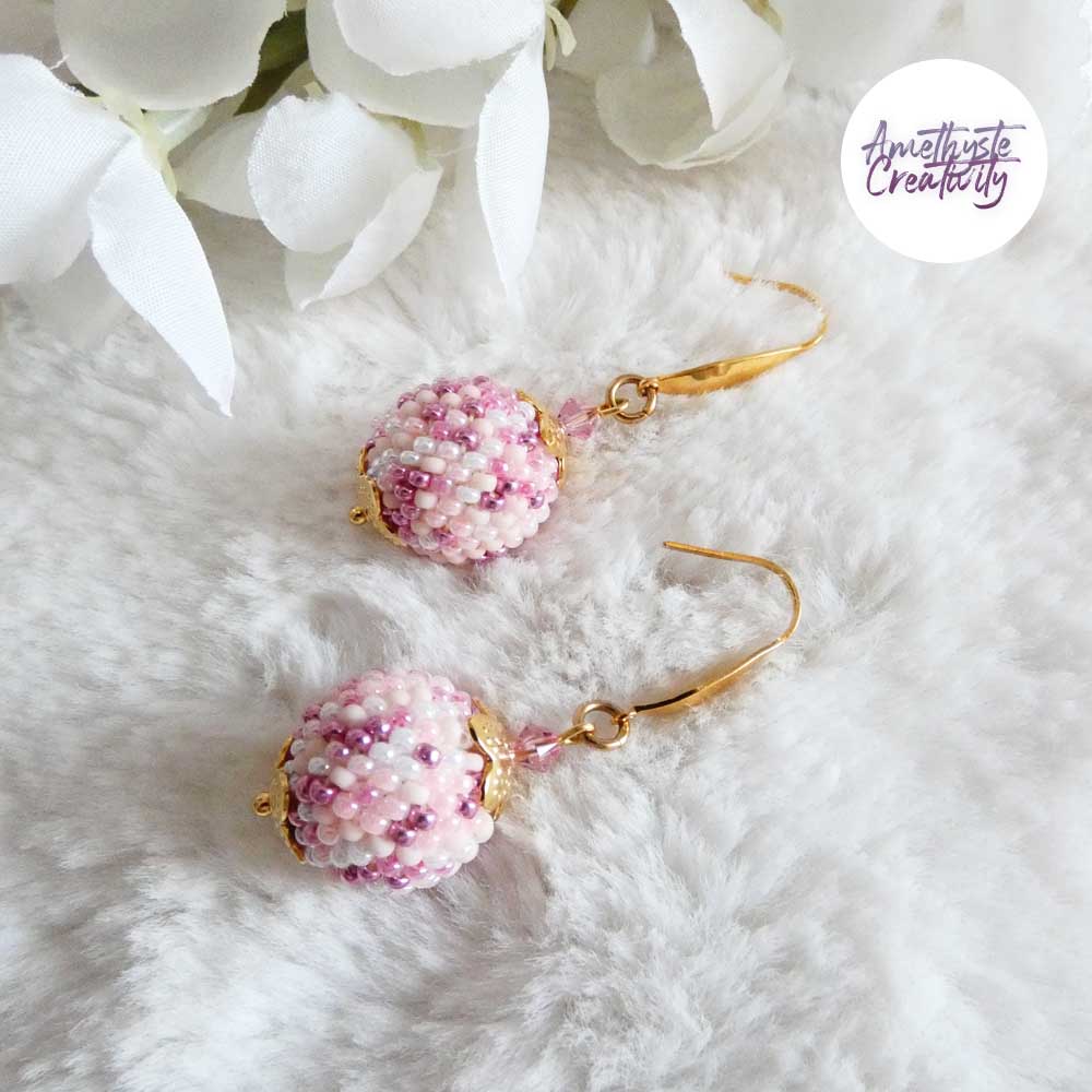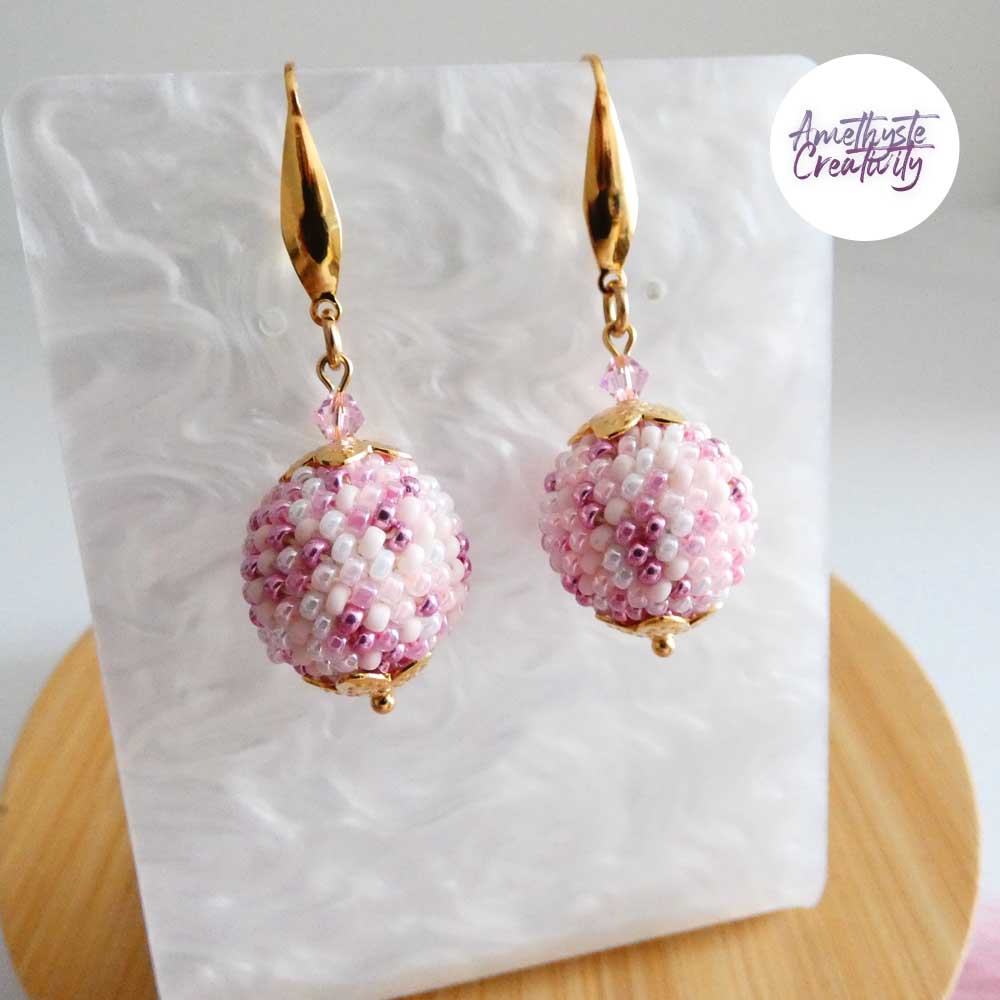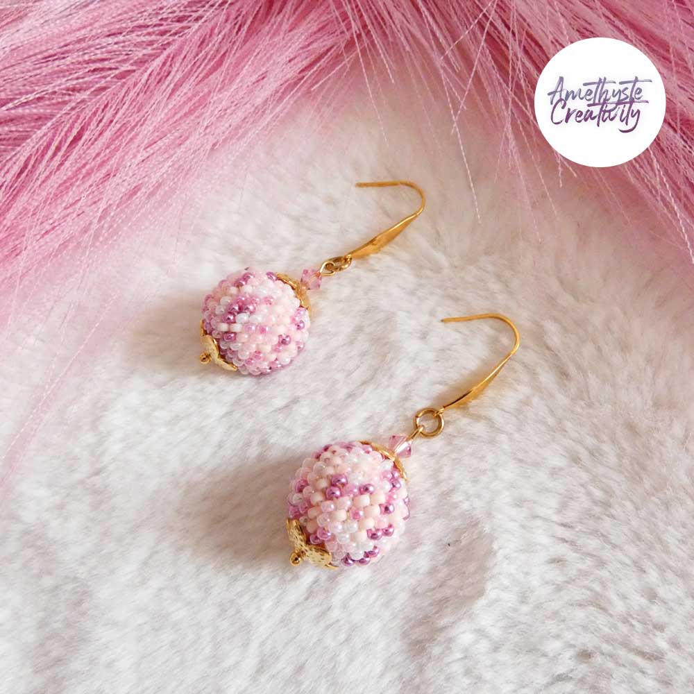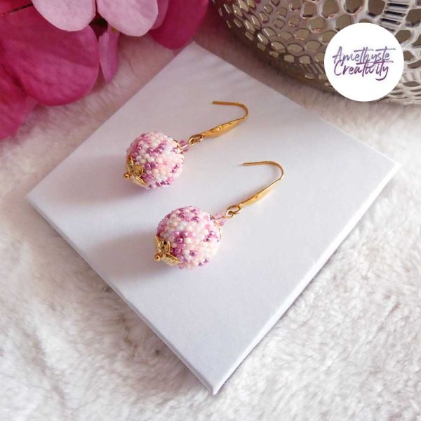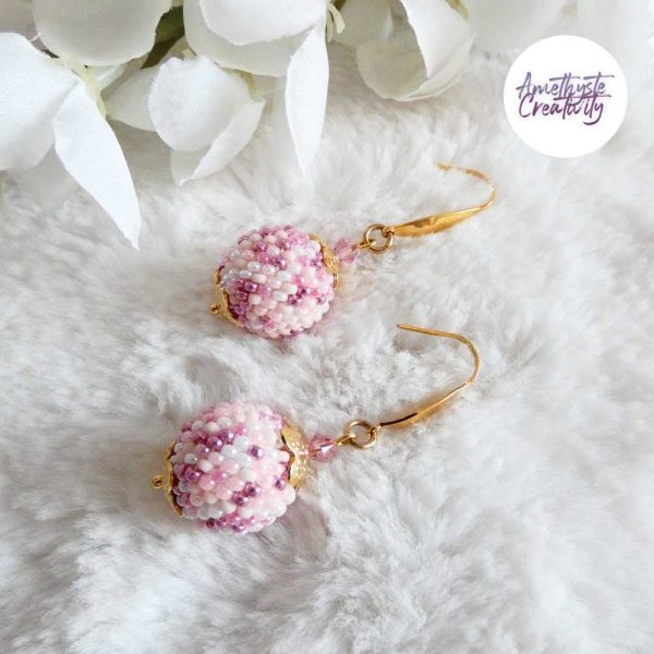 Je vous présente des Boucles d’oreilles en forme de boules réalisées au crochet avec des perles japonaise “Miyuki” de 11/0 (2mm). Ces boucles d’oreilles sont réalisées à la main par mes soins.